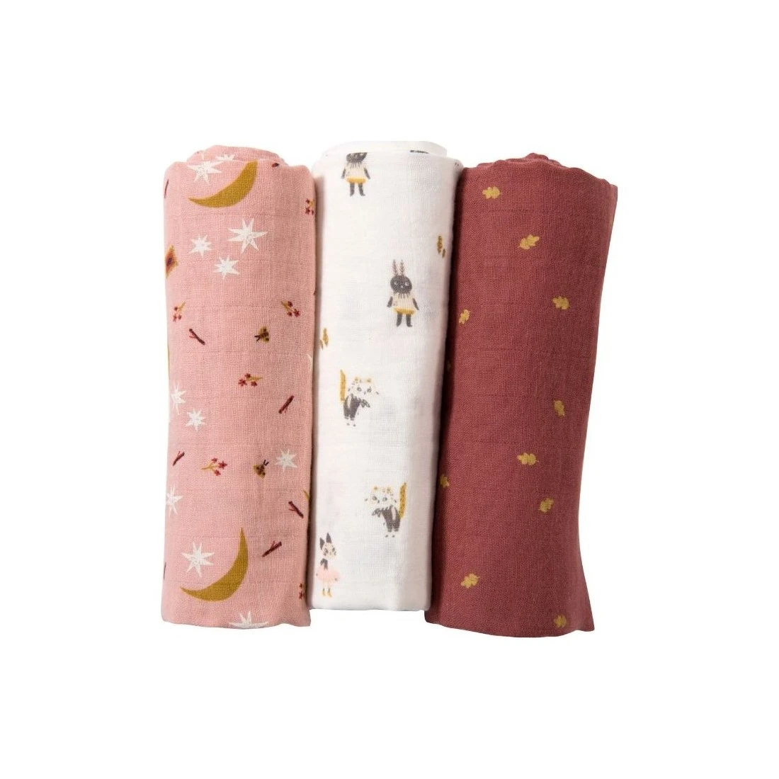 Le set de 3 langes de la collection de Moulin Roty est un coffret composé de illustrés aux couleurs de la gamme.