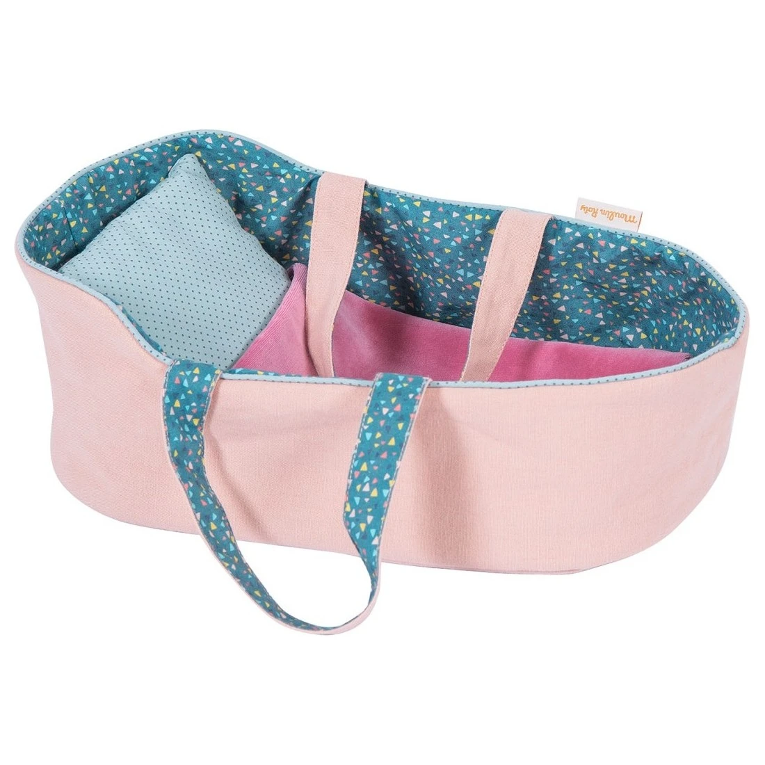 En lin rose poudré, doublé de coton à motif fleuri bleu turquoise, votre petit pourra coucher sa poupée comme lui se retrouve le soir dans son lit : la tête sur l’oreiller et bordé par une couverture.