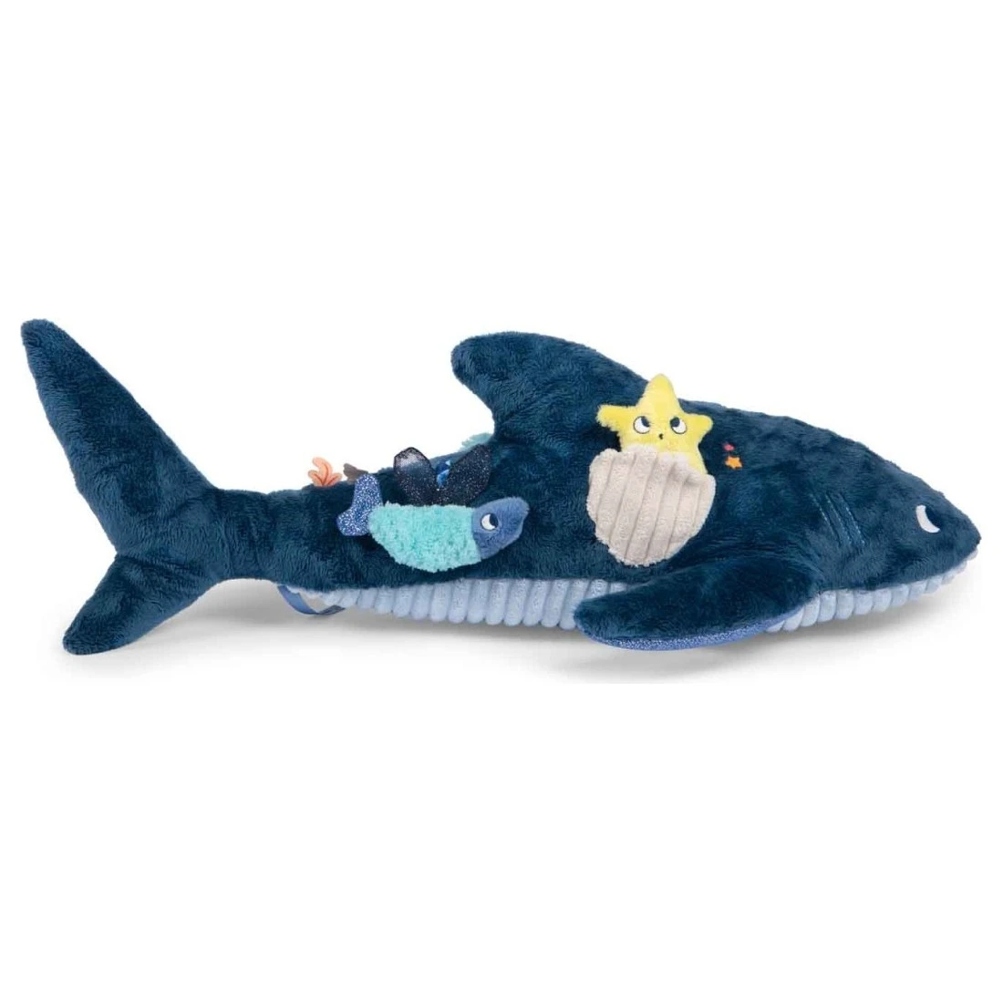 Une de la nouvelle série . Ce gentil requin bi-matières cherche un ami pour jouer ! Sur son dos tout doux sont cachées de petites créatures marines comme autant d’activités sensorielles à découvrir : miroir, grelot, papier crissant, étiquettes à attraper…