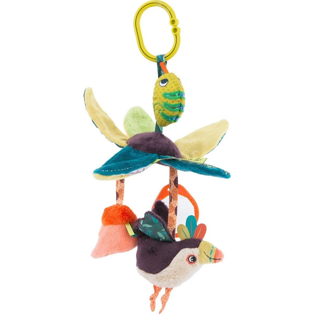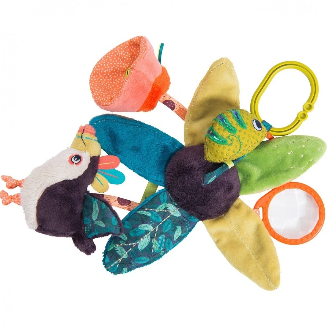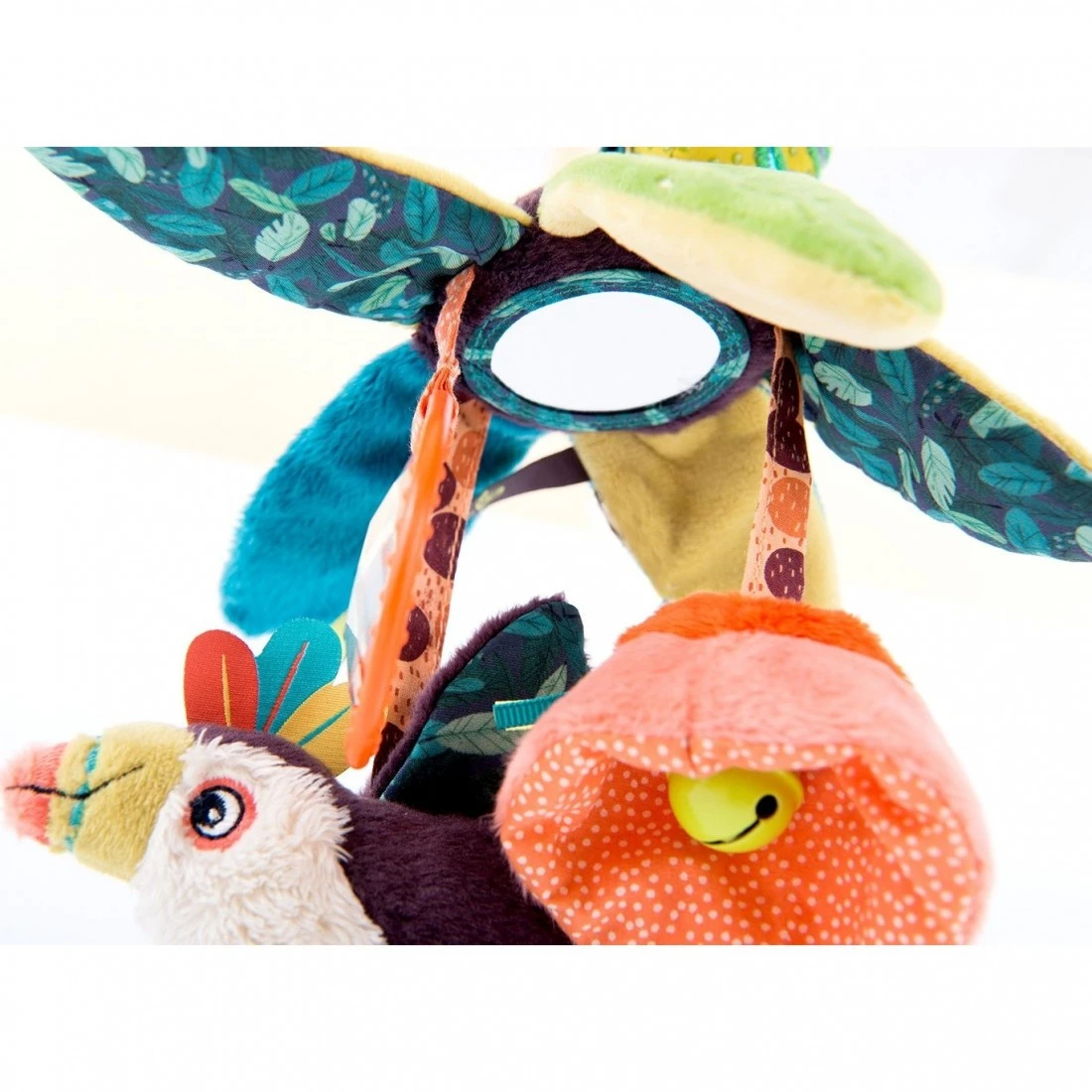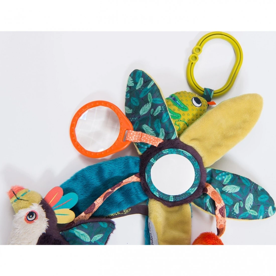 La suspension feuilles a plein de surprises pour bébé ! Les feuilles de la jungle font un bruit de papier crissant, cachés sous ces feuilles, bébé découvrira un prisme et une fleur avec un grelot. Pakou le toucan se transforme en hochet pour accompagner bébé dans ses découvertes, avec son copain caméléon qui fait pouet.