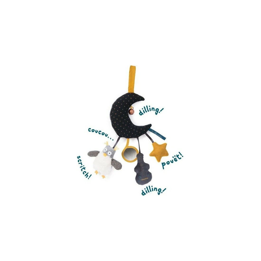 la Lune d’activités de la collection « » est un d’activités à suspendre pour éveiller les bébés . Ce est plein de surprise et de découvertes pour bébé. En dessous de la belle lune noire et or en coton et velours sont accrochés un hibou tout doux avec du papier crissant à l’intérieur de ses ailes, ainsi qu’un miroir magique, une contrebasse qui fait un bruit de , un et une quand bébé l’attrape.