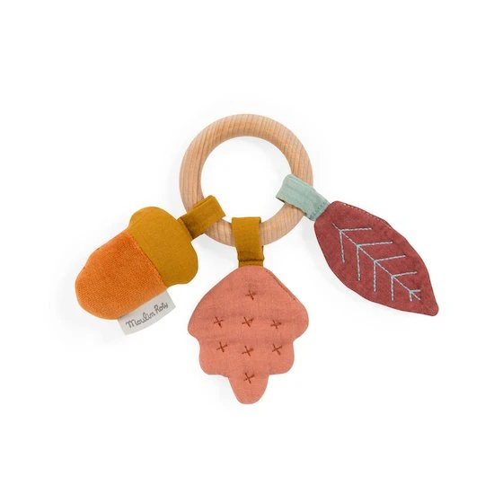 Ce hochet en bois naturel de chez Moulin Roty en forme d’anneau comporte une feuille de chêne, une feuille avec papier bruissant et un gland avec des grelots.
