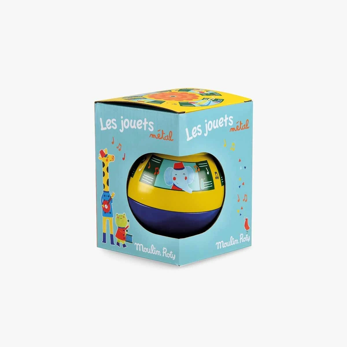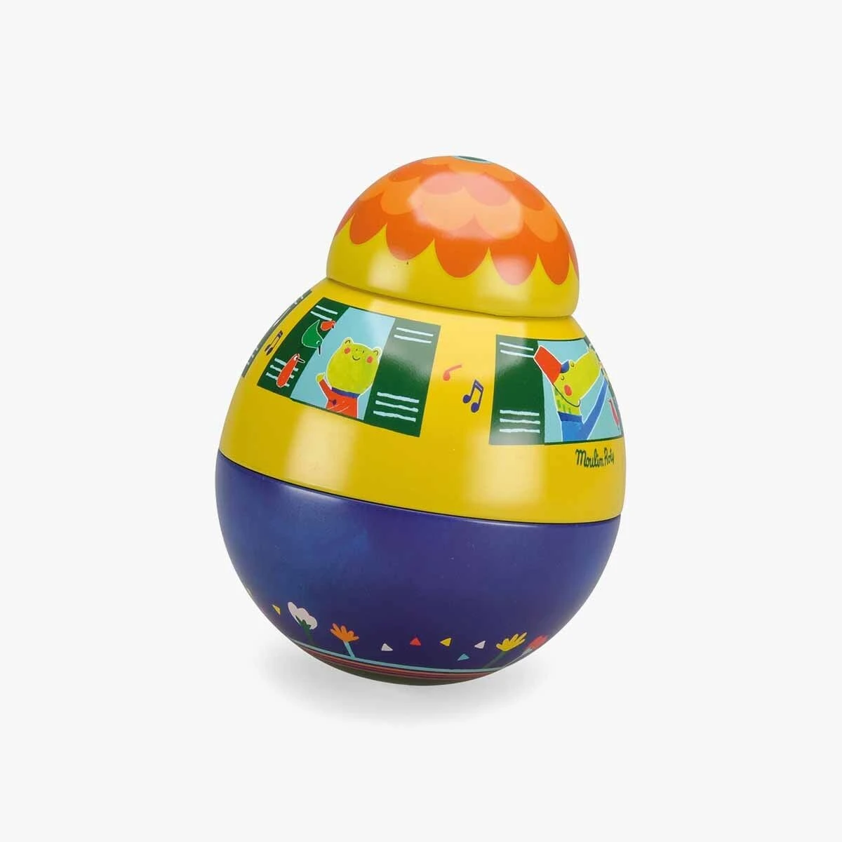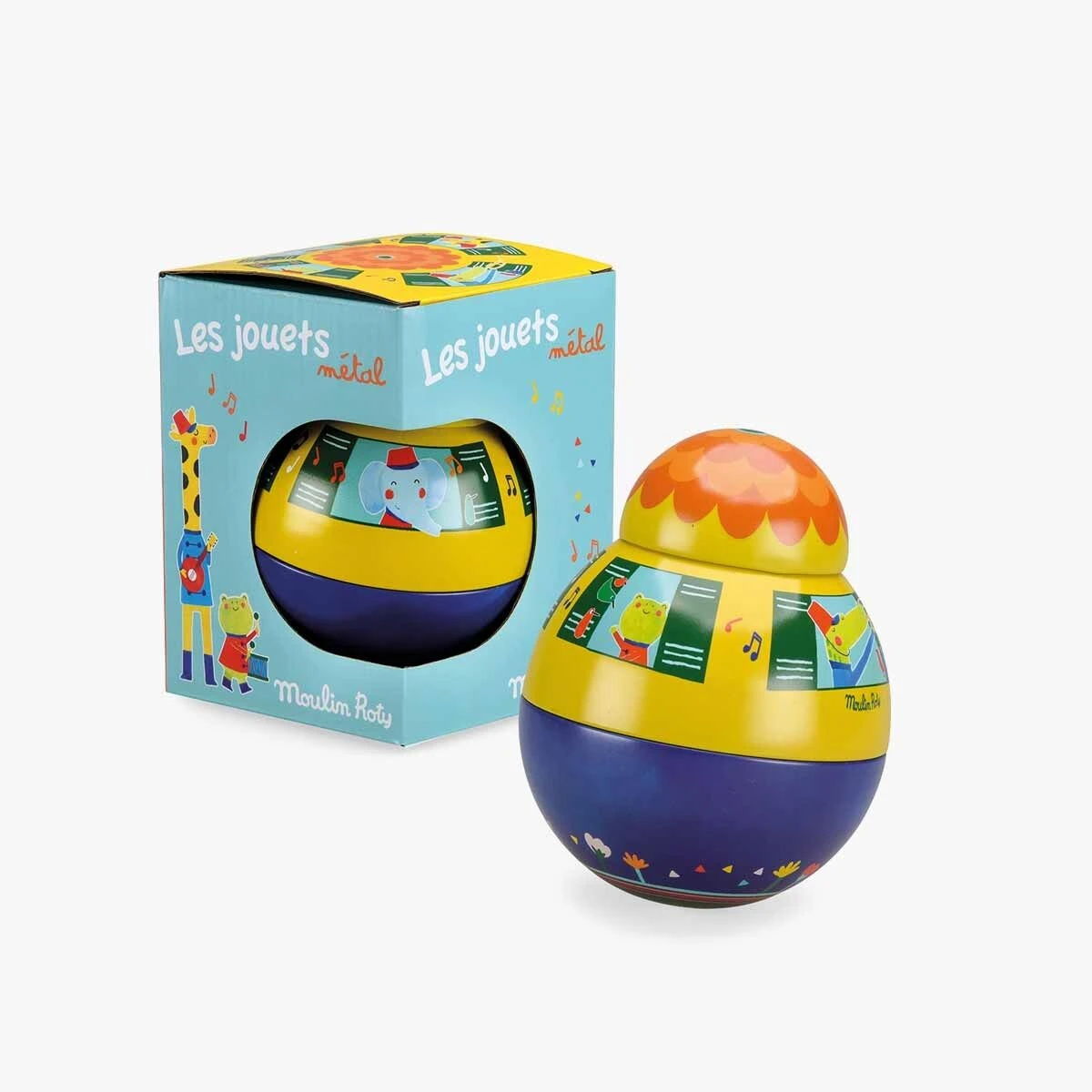 Culbuto en métal coloré, illustré d’une fanfare d’animaux joyeux et colorés. Il se balance au son d’un joyeux carillon d’avant en arrière sans jamais se renverser. Bébé va adorer le basculer dans tous les sens.
