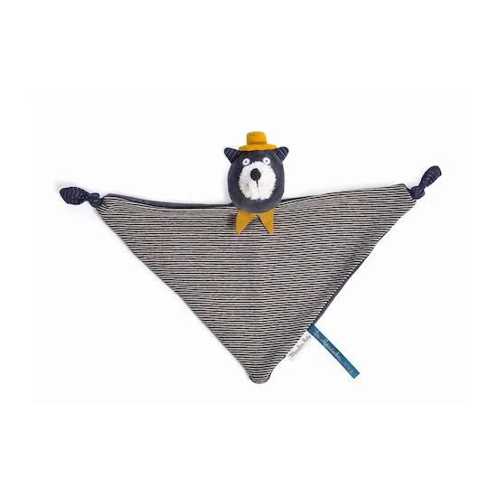 Ce doudou plat Alphonse reprend les tons de la collection Les moustaches de Moulin Roty.