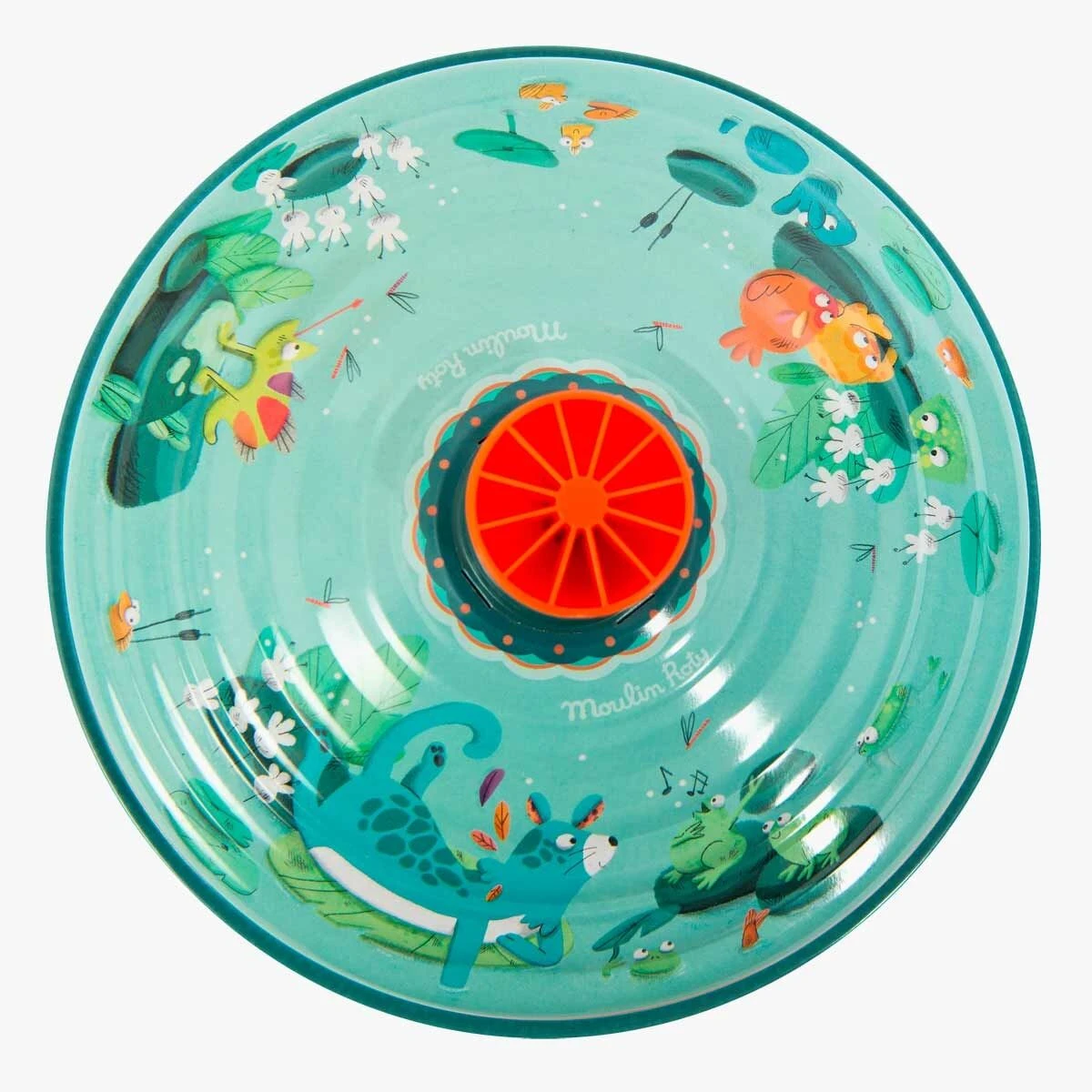 Grande toupie en métal couleur vert d’eau, illustrée des animaux de la jungle barbotant dans la marre… Surprise ! En lançant la toupie, elle se met à siffler ! Un classique des jeux qui amusent autant les petits que les grands.