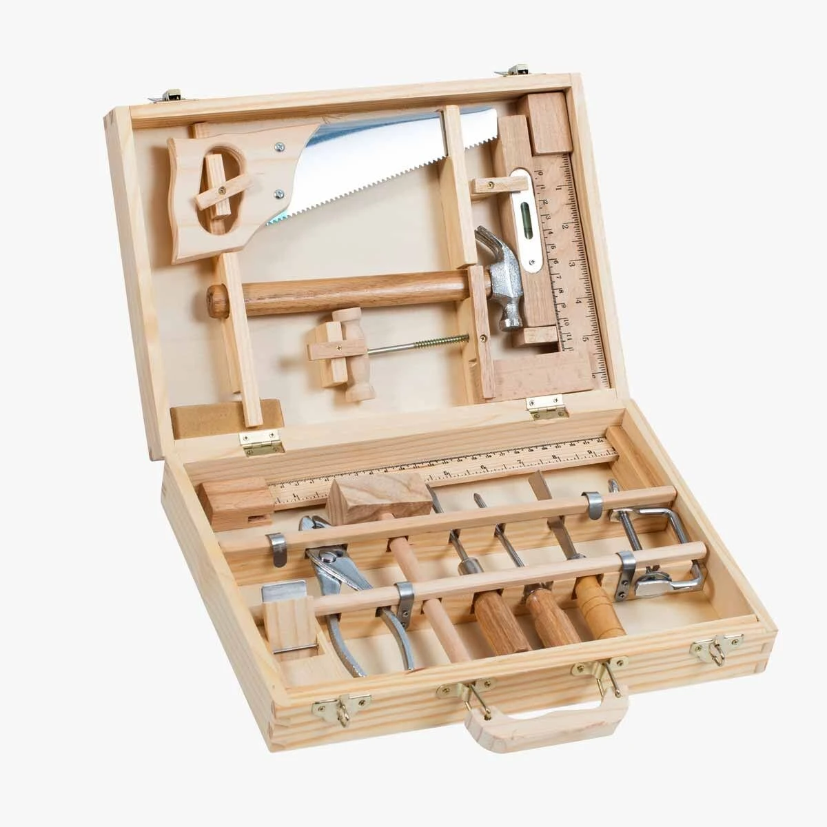 Tout l’univers de l’atelier bricolage contenu dans une valise en bois! Pour faire comme les grands, se construire des mondes et se raconter des histoires, 14 vrais outils : une scie, un marteau, un burin, un niveau, une règle et son crayon, des tournevis…