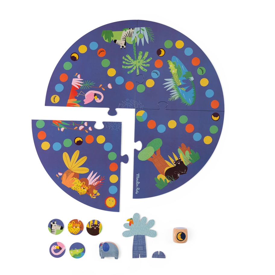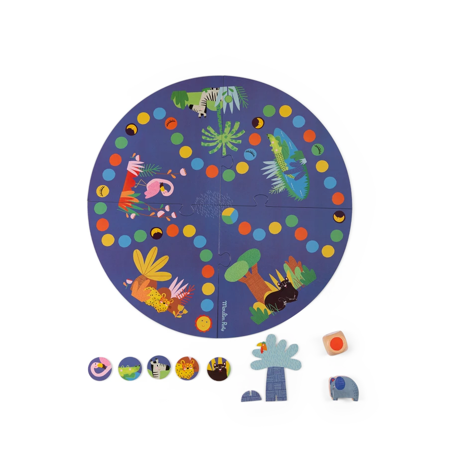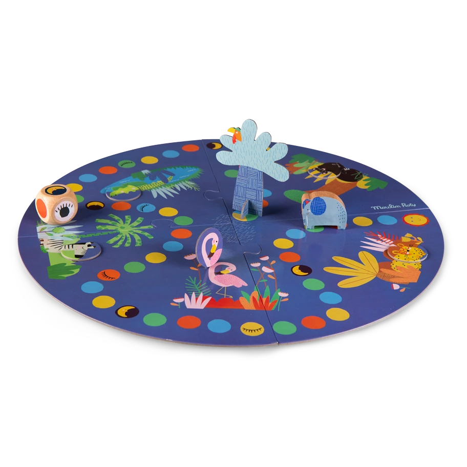Jeu coopératif où les joueurs doivent progresser ensemble sur le parcours de couleurs pour accompagner Léon l’éléphant au pied de l’arbre bleu, sans réveiller les Toupitis. Contient 1 plateau illustré, 1 dé et 5 jetons animaux. De 2 à 4 joueurs. Dès 3 ans