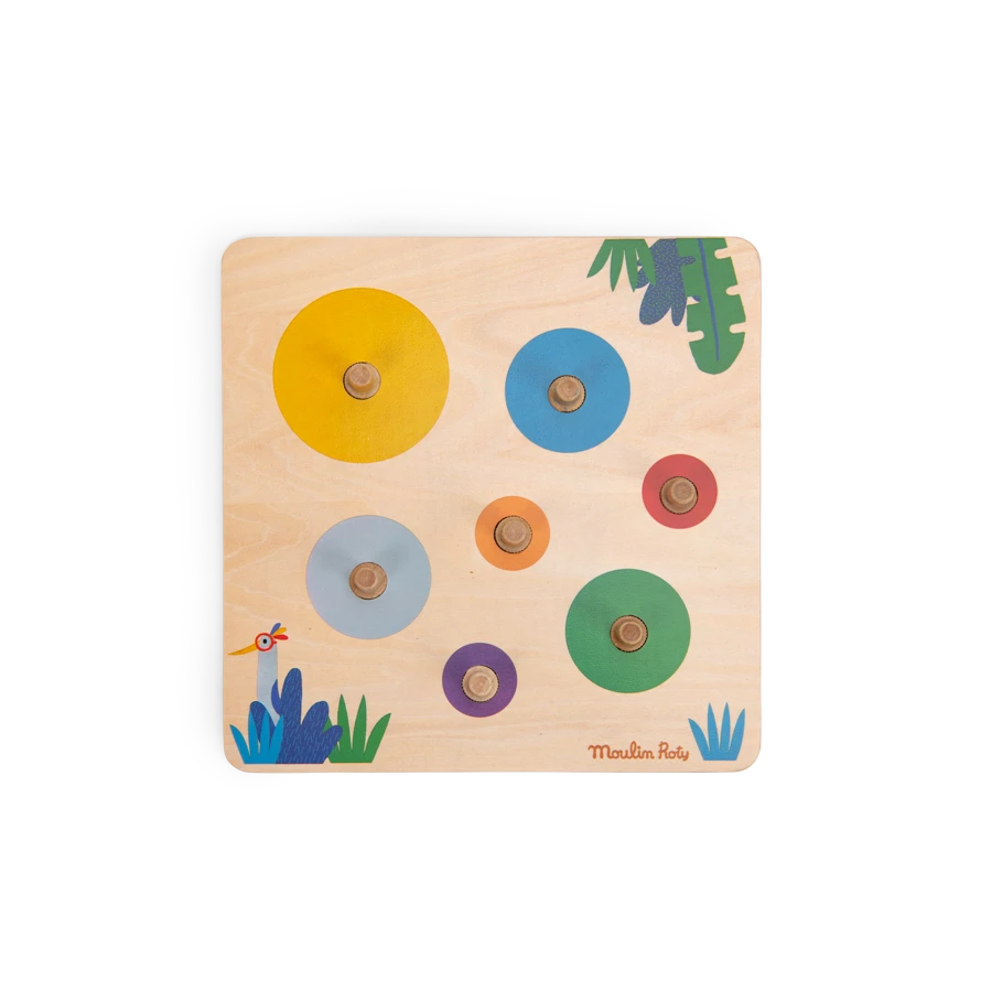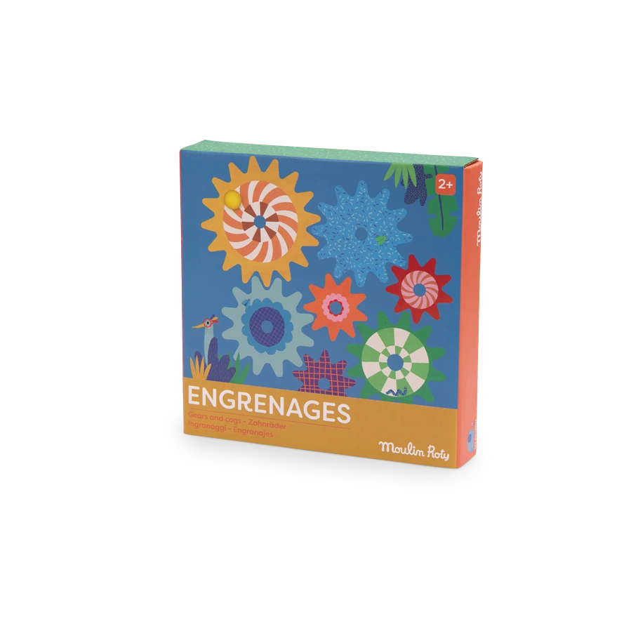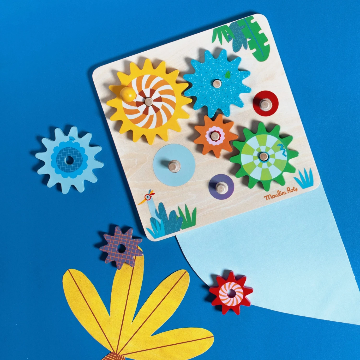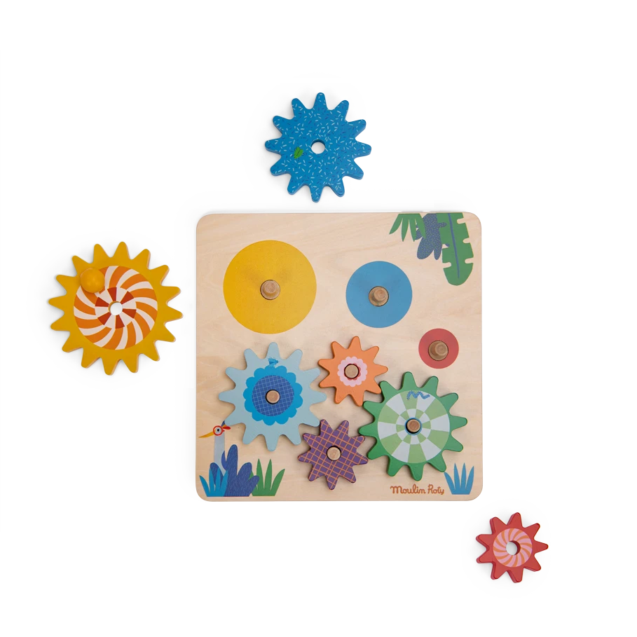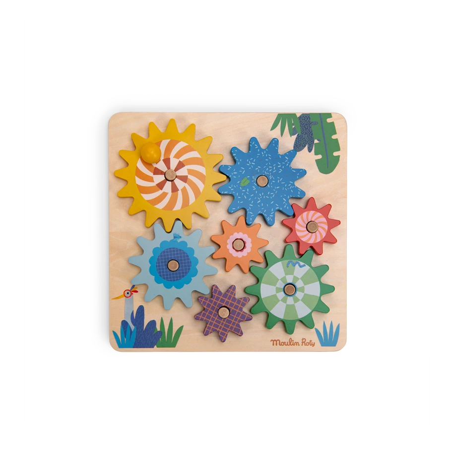Jeu en bois pour découvrir les mécanismes à engrenages. 7 roues crantées multicolores à positionner au bon endroit sur les piliers en bois. En actionnant la roue jaune avec la poignée, l’ensemble se met à tourner dans tous les sens. Dès 2 ans.