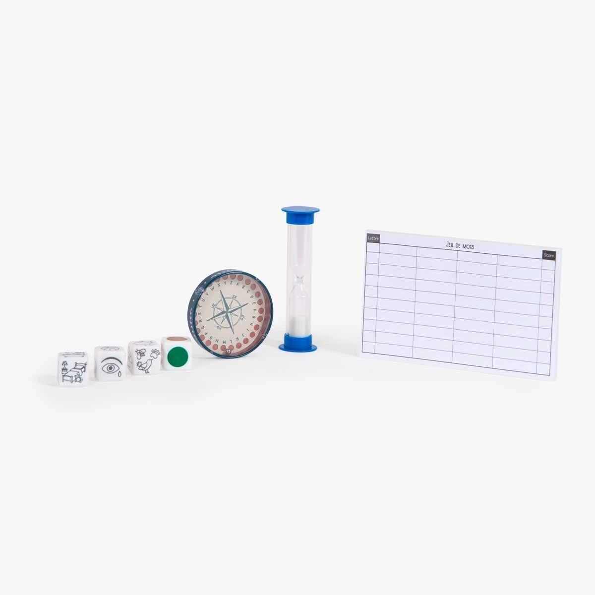 Pour s’amuser pendant la veillée au coin du feu : 4 dés à thème, 1 boîte alphabet et des carnets de notes pour trouver des mots correspondants au thème et à la lettre choisie, dans la limite du sablier ! À jouer en mode compétition ou collaboration.