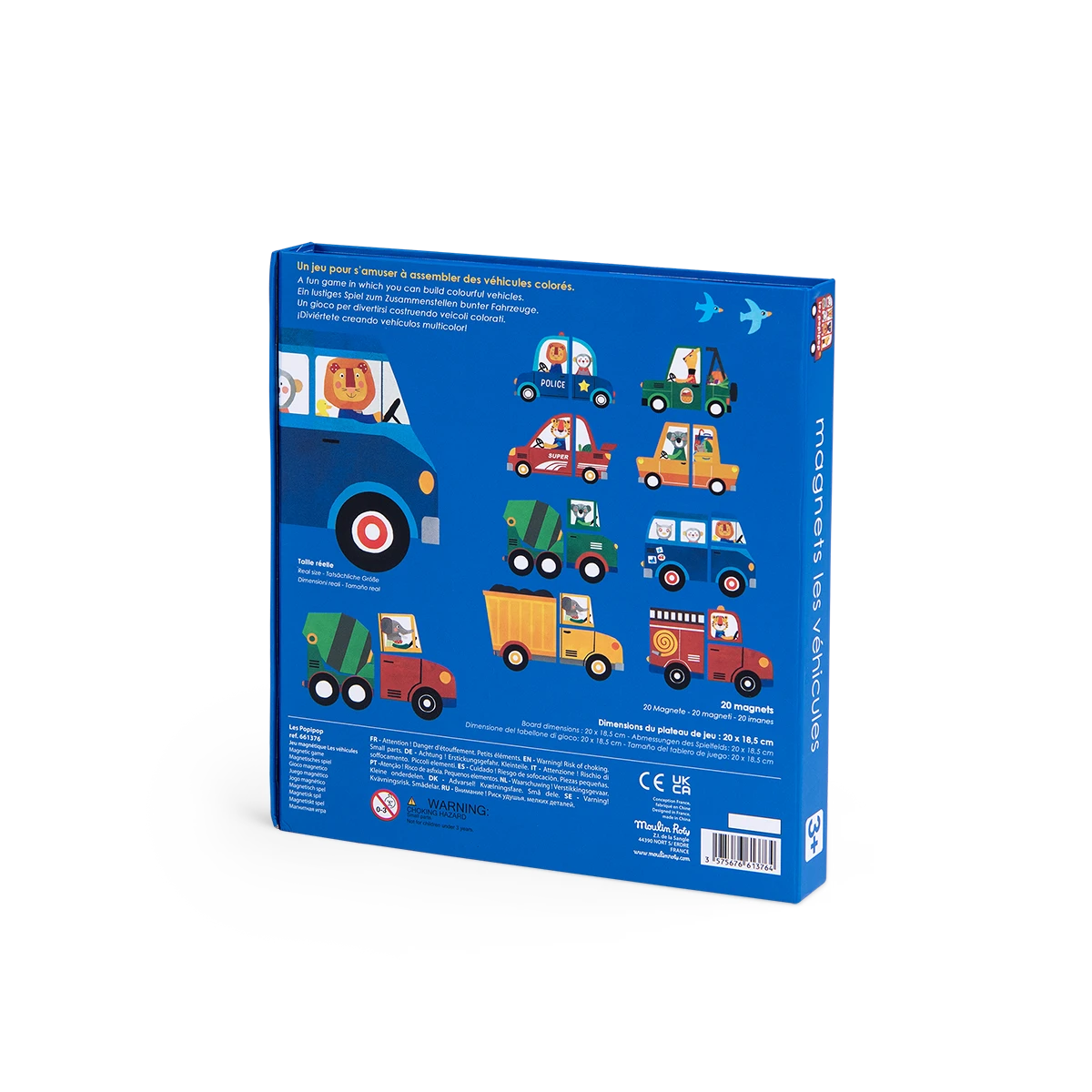 Voiture de police, camion de pompiers, camion toupie … avec aux commandes Les Popipop ! Un jeu éducatif présenté dans une boite coffret magnétique pour s’amuser à recomposer les 8 véhicules colorés composés de 2 ou 3 pièces chacun à l’aide des 20 magnets.