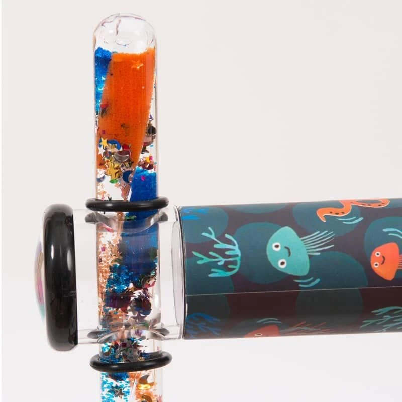 Kaléidoscope aux illustrations naïves et colorées pieuvres et coraux avec à son extrémité un tube coulissant contenant du gel et des paillettes qui, associé aux petits miroirs du kaléidoscope, démultiplie à l’infini les combinaisons de formes et de couleurs.