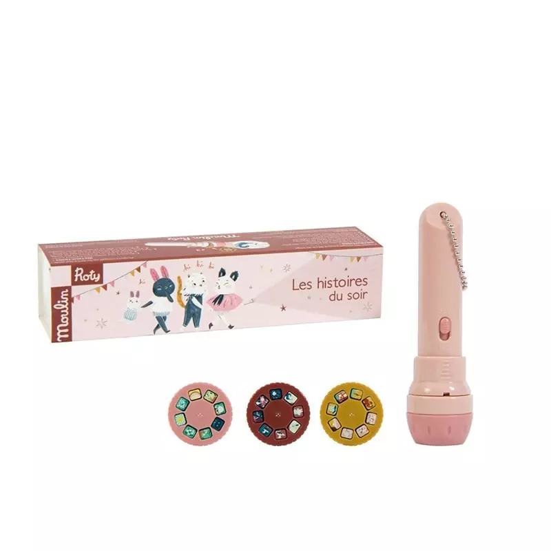 Une lampe de poche qui raconte des histoires…L’enfant choisit son histoire et insère le disque correspondant devant la lumière. Il suffit ensuite de faire défiler les différentes images à la manière d’un diapositive.L’enfant peut regarder les images défiler écouter l’histoire ou l’inventer lui-même.La différence de taille entre la toute petite diapo et la grosse image projetée fascinera l’enfant qui explorera les possibilités du matériel : si j’avance la lampe du mur l’image se réduit si je l’éloigne elle s’agrandit mais n’est plus nette…Une activité ludique à partager en famille et une alternative originale au livre papier.