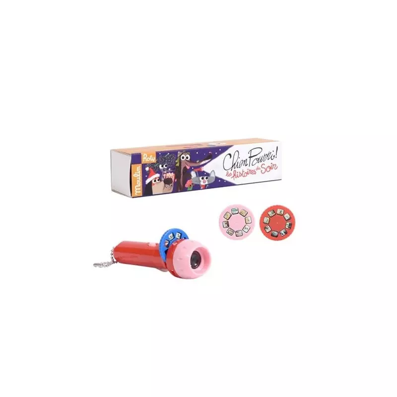 Une lampe de poche qui raconte des histoires…L’enfant choisit son histoire et insère le disque correspondant devant la lumière. Il suffit ensuite de faire défiler les différentes images à la manière d’un diapositive.L’enfant peut regarder les images défiler écouter l’histoire ou l’inventer lui-même.La différence de taille entre la toute petite diapo et la grosse image projetée fascinera l’enfant qui explorera les possibilités du matériel : si j’avance la lampe du mur l’image se réduit si je l’éloigne elle s’agrandit mais n’est plus nette…Une activité ludique à partager en famille et une alternative originale au livre papier.9