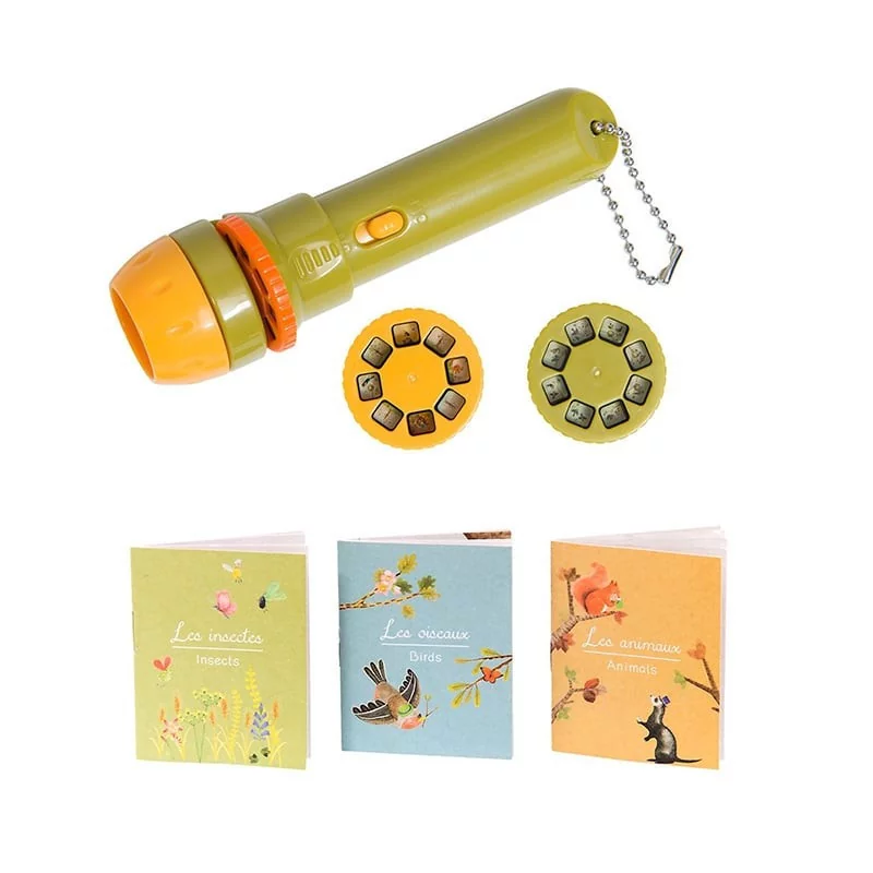 Une lampe de poche qui raconte des histoires…L’enfant choisit son histoire et insère le disque correspondant devant la lumière. Il suffit ensuite de faire défiler les différentes images à la manière d’un diapositive.L’enfant peut regarder les images défiler écouter l’histoire ou l’inventer lui-même.La différence de taille entre la toute petite diapo et la grosse image projetée fascinera l’enfant qui explorera les possibilités du matériel : si j’avance la lampe du mur l’image se réduit si je l’éloigne elle s’agrandit mais n’est plus nette…Une activité ludique à partager en famille et une alternative originale au livre papier.