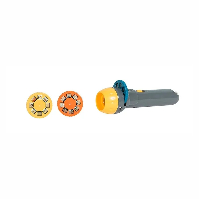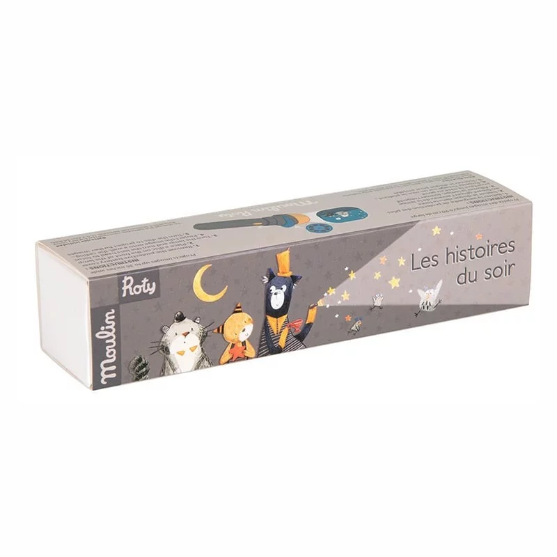 Une lampe de poche qui raconte des histoires…L’enfant choisit son histoire et insère le disque correspondant devant la lumière. Il suffit ensuite de faire défiler les différentes images à la manière d’un diapositive.L’enfant peut regarder les images défiler écouter l’histoire ou l’inventer lui-même.La différence de taille entre la toute petite diapo et la grosse image projetée fascinera l’enfant qui explorera les possibilités du matériel : si j’avance la lampe du mur l’image se réduit si je l’éloigne elle s’agrandit mais n’est plus nette…Une activité ludique à partager en famille et une alternative originale au livre papier.