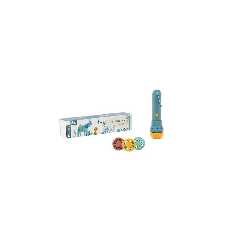 Une lampe de poche qui raconte des histoires…L’enfant choisit son histoire et insère le disque correspondant devant la lumière. Il suffit ensuite de faire défiler les différentes images à la manière d’un diapositive.L’enfant peut regarder les images défiler écouter l’histoire ou l’inventer lui-même.La différence de taille entre la toute petite diapo et la grosse image projetée fascinera l’enfant qui explorera les possibilités du matériel : si j’avance la lampe du mur l’image se réduit si je l’éloigne elle s’agrandit mais n’est plus nette…Une activité ludique à partager en famille et une alternative originale au livre papier.