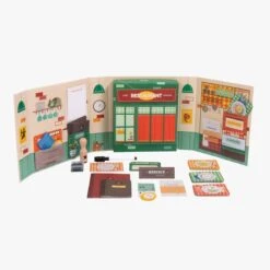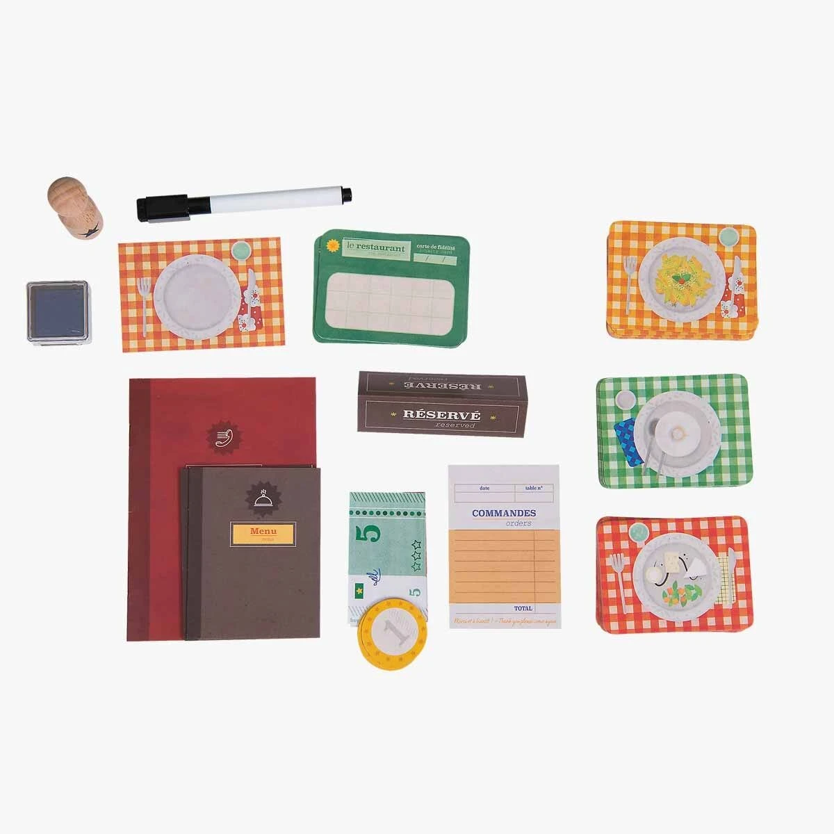 Coffret en carton « Le Restaurant » avec 2 volets à déployer. Une fois installé, la journée commence : menus, bloc-notes, addition… ainsi qu’un tampon et un crayon effaçable pour l’ardoise du jour ! Tout le nécessaire pour jouer et imaginer son quotidien !