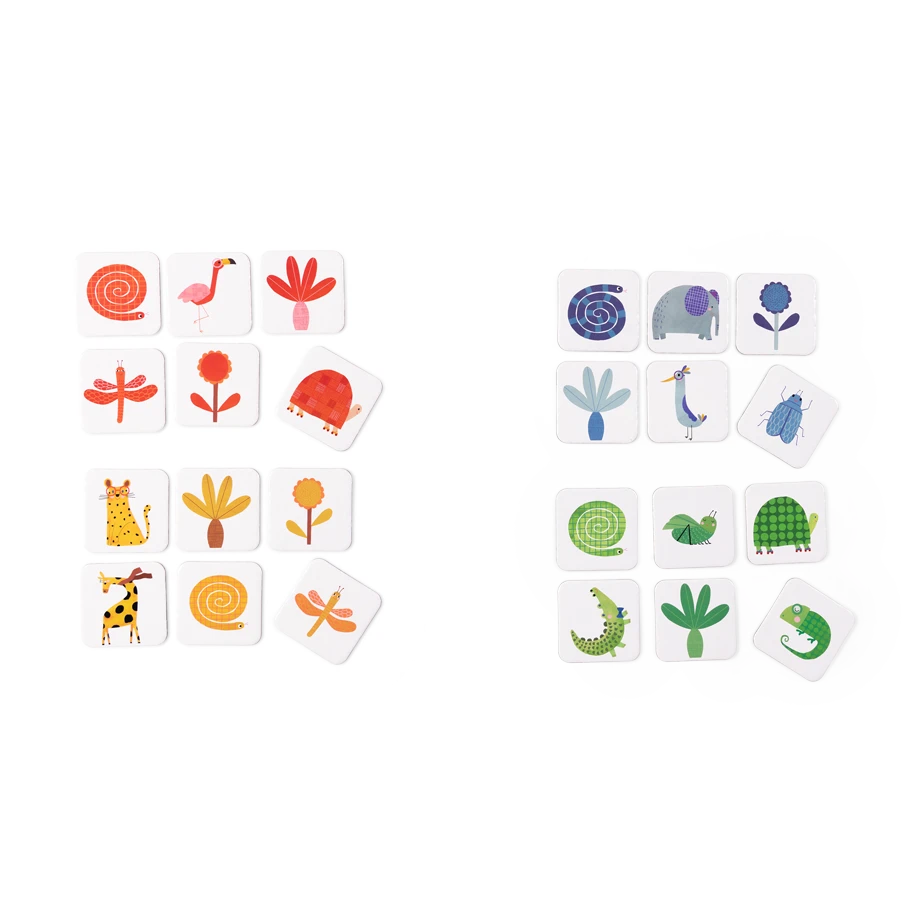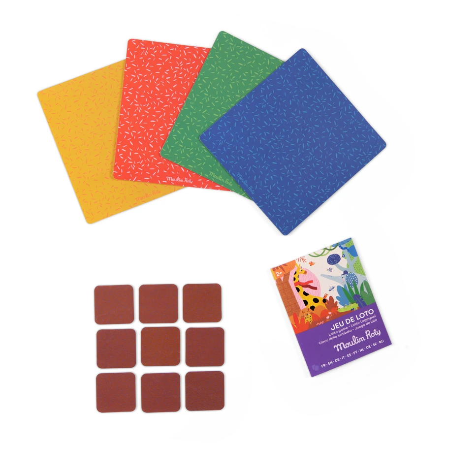 Loto Les Toupitis traité comme un imagier, comprend 4 planches de couleurs illustrées des animaux et végétaux de la collection pour observer et associer des images. Le 1er à avoir complété entièrement sa ou ses planches remporte la partie. Dès 2 ans.
