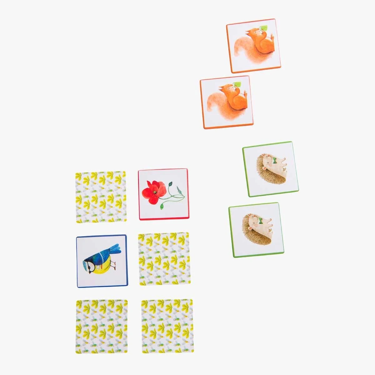 Le mémo de la nature comportant un jeu de 36 paires de cartes illustrées des éléments du jardin : feuille, châtaigne, coccinelle, coquelicot…