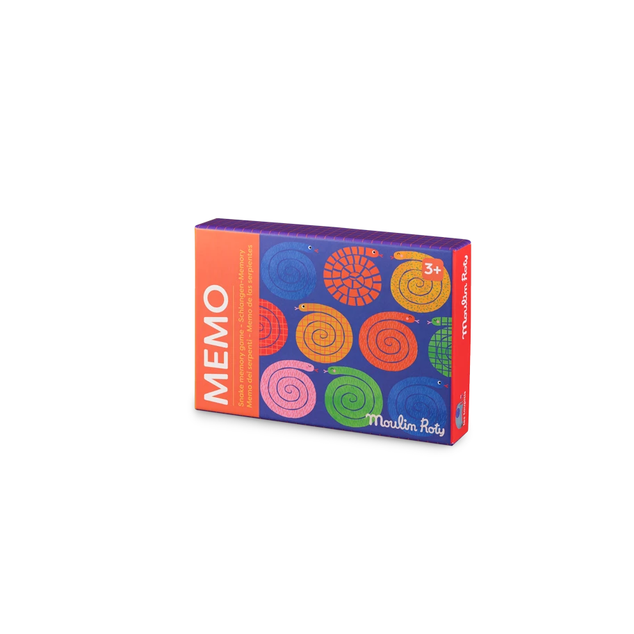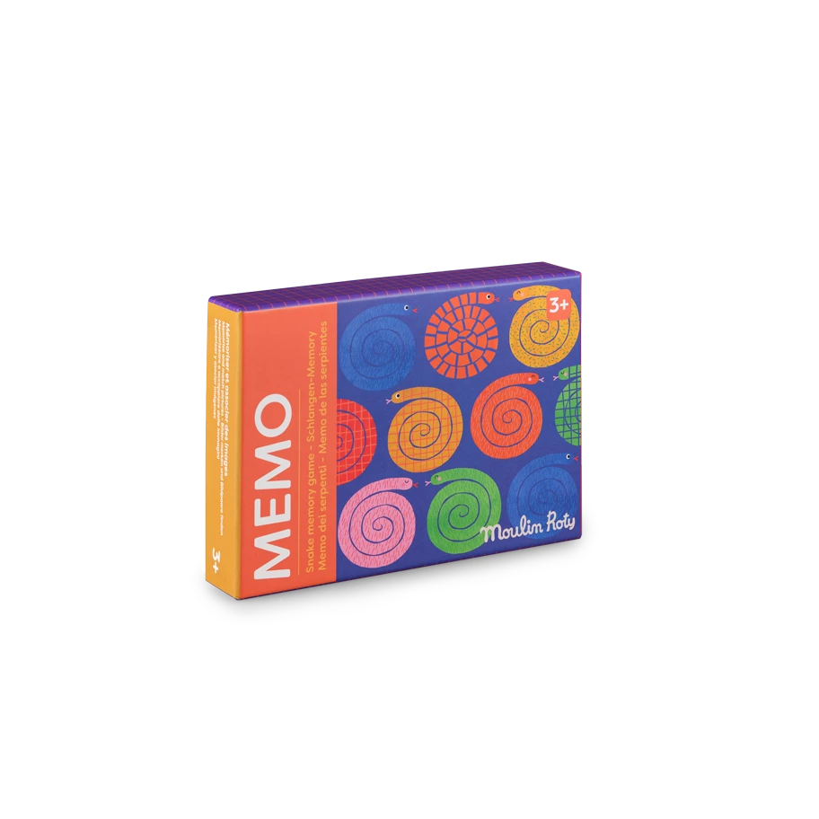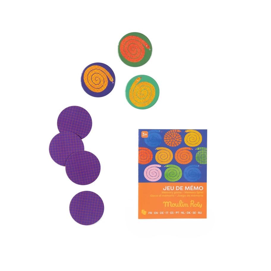 Jeu d’observation et mémoire des motifs et couleurs sur le thème des serpents ! Toutes les cartes rondes joliment illustrées, sont faces cachées sur la table, celui qui collecte le plus de paires de serpents est le gagnant. Contient 28 cartes. Dès 3 ans.