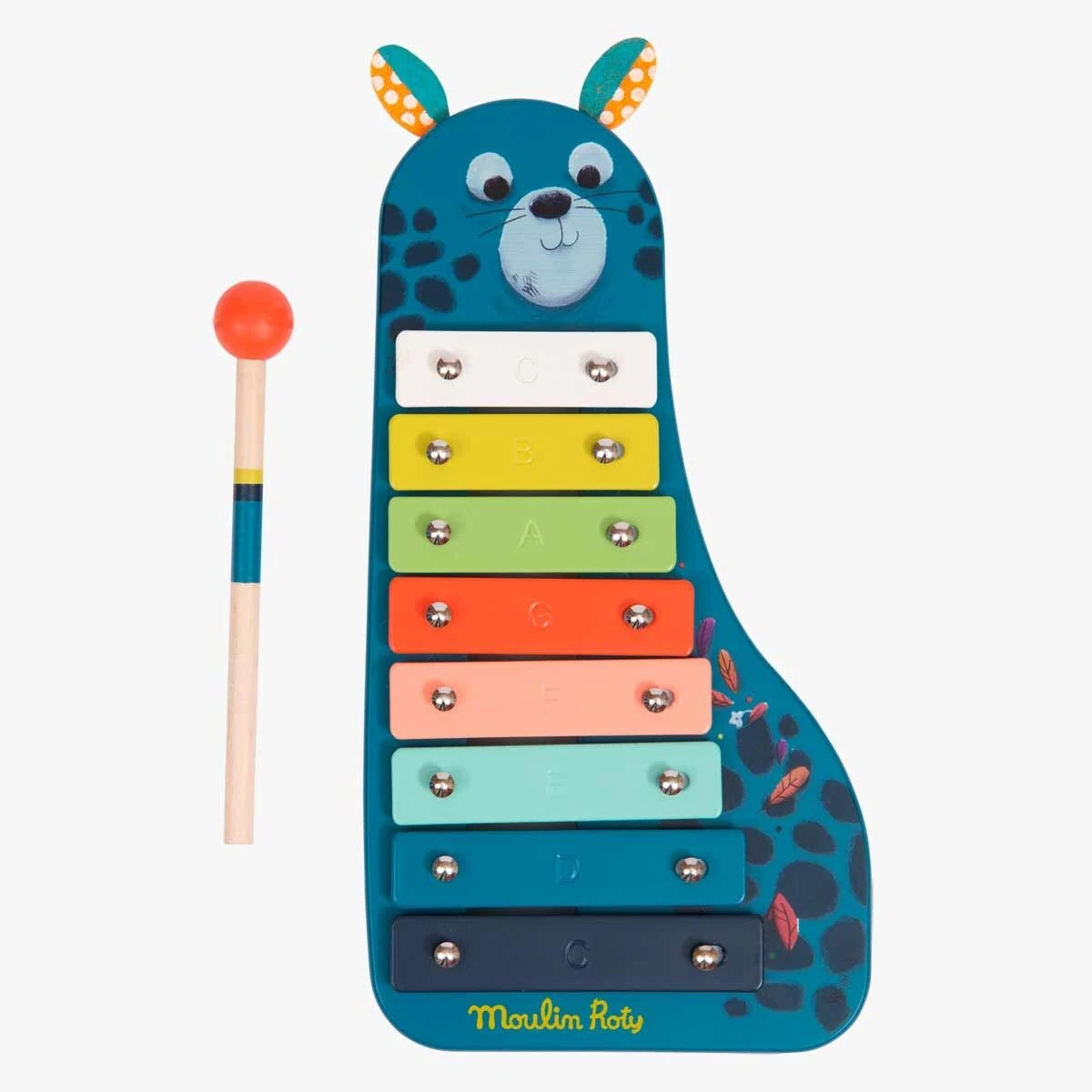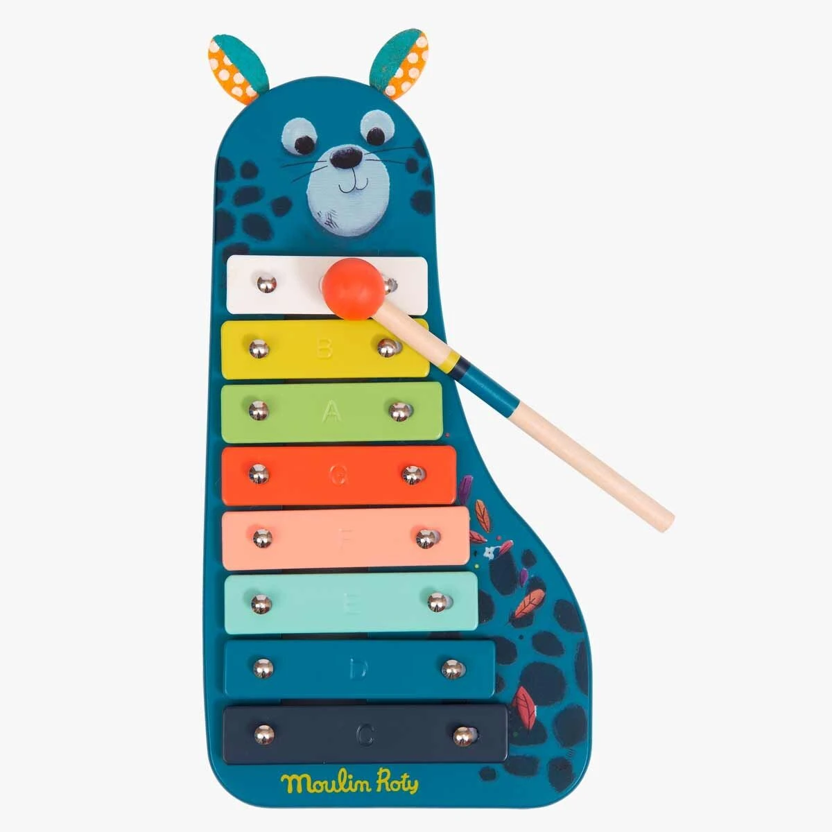 Pour futurs musiciens, métallophone multicolore à 8 tons avec mailloche. Son socle bois aux formes arrondies est illustré de Zimba la panthère avec deux oreilles en feutrine. Développe le rythme, la motricité et l’éveil musical des tout-petits.
