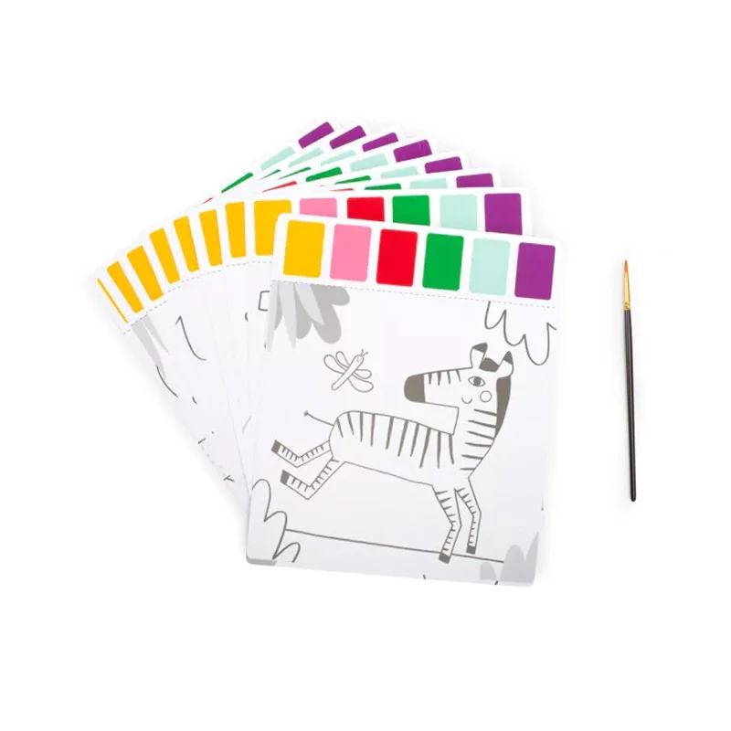Une pochette comprenant 10 illustrations de la collection Les Toupitis Ă peindre grâce au pinceau et Ă la palette de couleurs intĂ©grĂ©s.Â