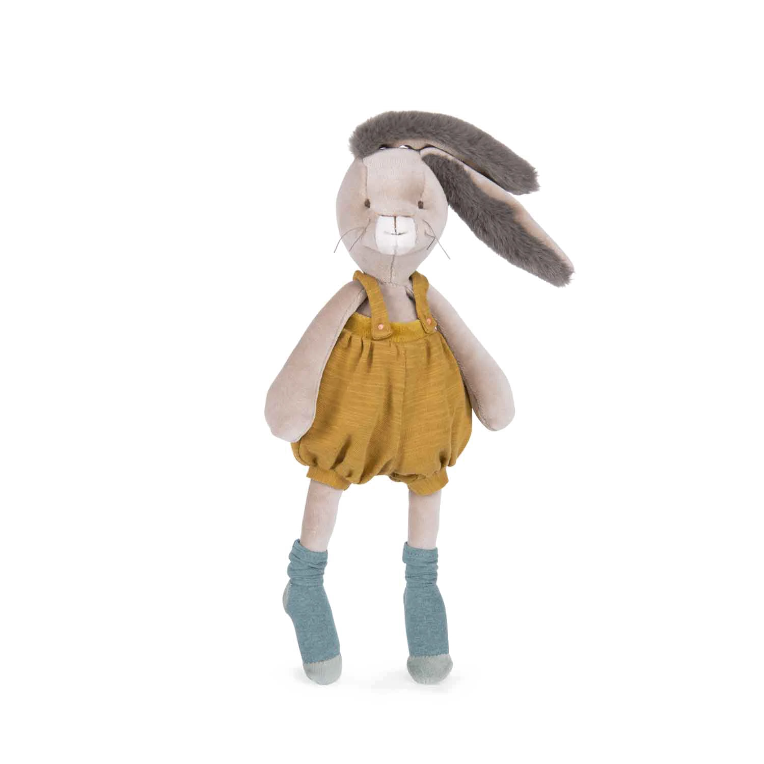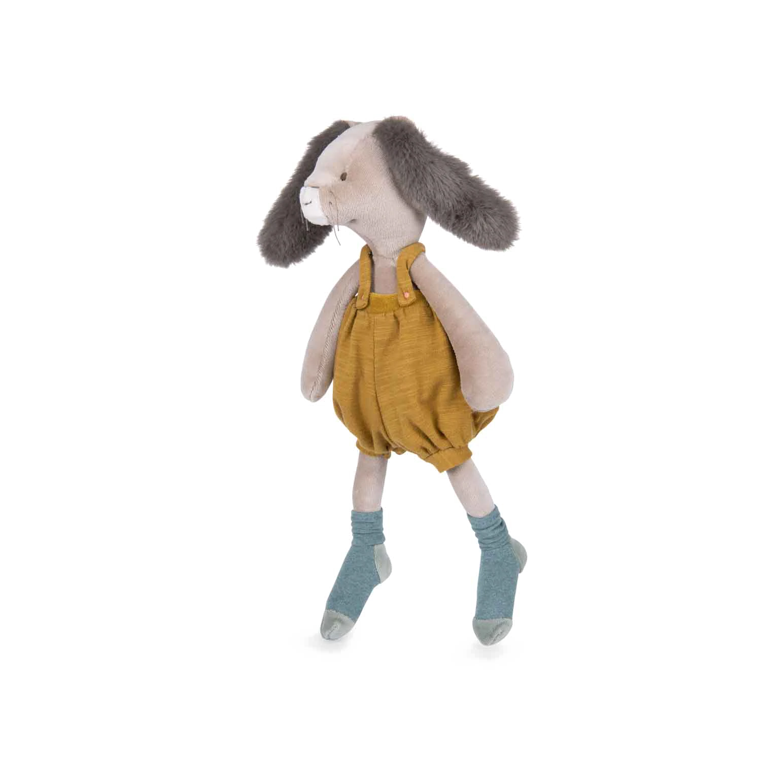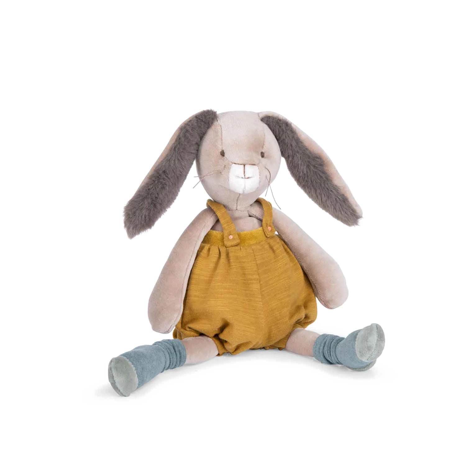 Avec sa frimousse Ă moustaches et ses grandes oreilles toutes douces, cet adorable lapin Ă la salopette ocre ne demande qu’Ă faire des câlins ! Compagnon de jeu la journĂ©e et doudou protecteur la nuit, il accompagnera bĂ©bĂ©.