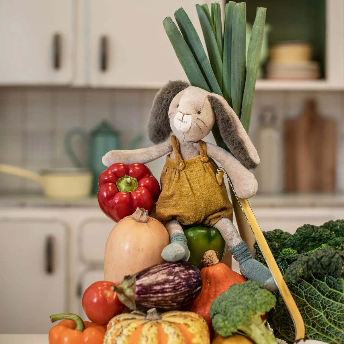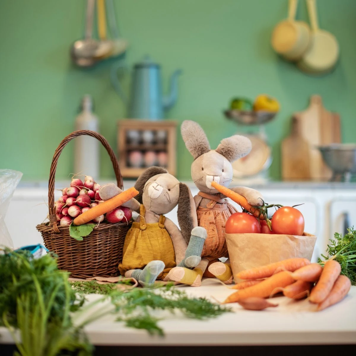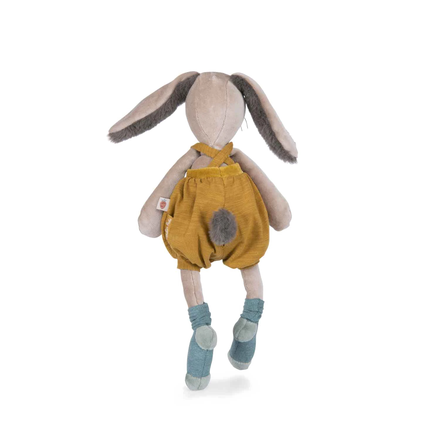 Avec sa frimousse Ă moustaches et ses grandes oreilles toutes douces, cet adorable lapin Ă la salopette ocre ne demande qu’Ă faire des câlins ! Compagnon de jeu la journĂ©e et doudou protecteur la nuit, il accompagnera bĂ©bĂ©.