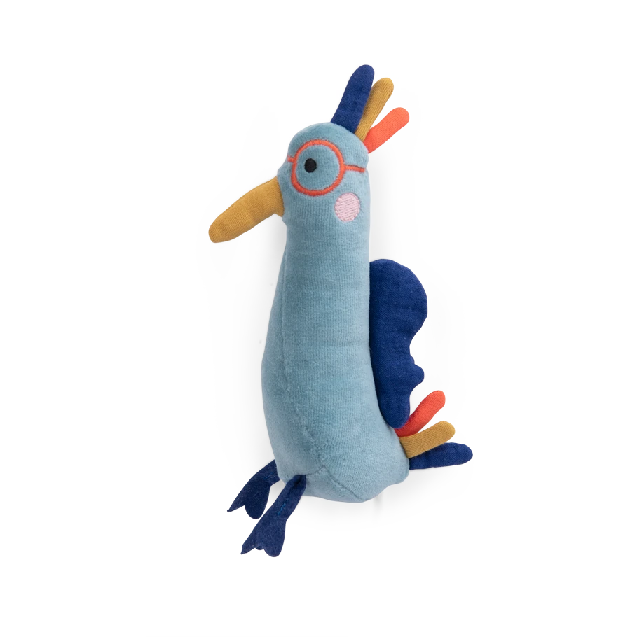 Petit oiseau bleu en velours tout doux. Paire de lunettes et crête dressée en éventail sur la tête, il ne laissera pas bébé indifférent avec son look qui détonne ! Dans son ventre se cachent de petites billes qui font du bruit quand on l’agite.