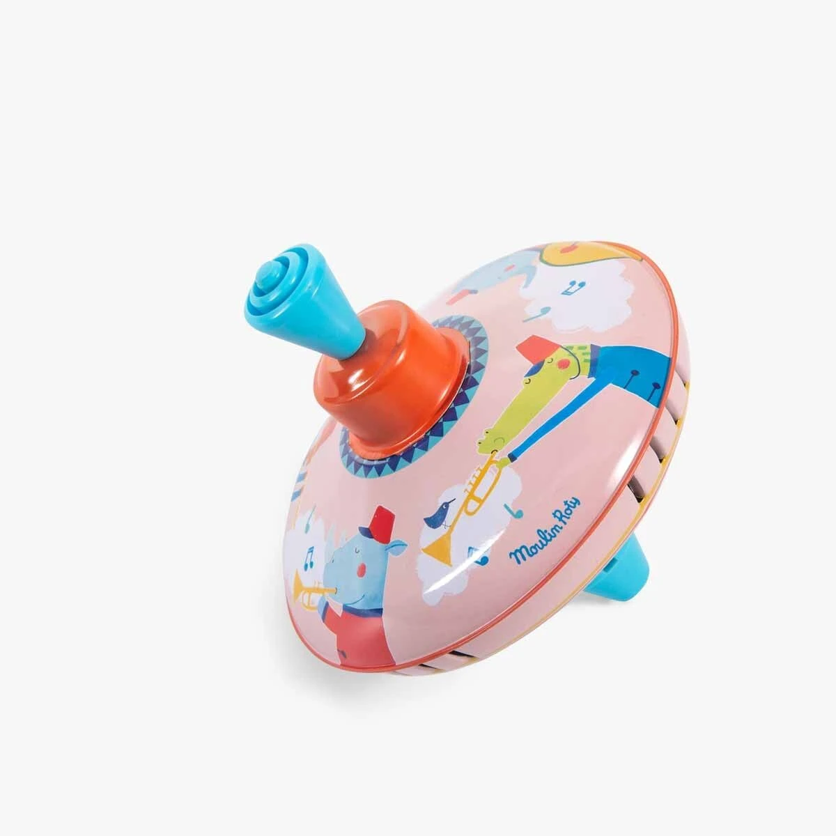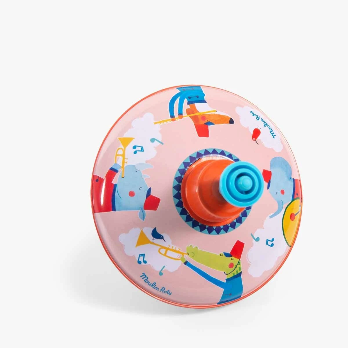Petite toupie en mĂ©tal, illustrĂ©e d’une fanfare d’animaux joyeux et colorĂ©s ! Les voilĂ qui avancent en cadence, au rythme de la toupie lancĂ©e Ă toute vitesse ! Un classique des jeux qui amusent autant les petits que les grands.