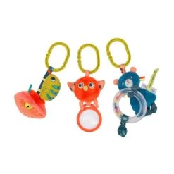 Suspension feuilles d’activités au jeu de couleurs, textures et motifs variés. Bébé va s’amuser avec les feuilles qui font scritch, l’étoile qui fait pouët. La lune et la girafe contiennent chacune un grelot. Il y a même un miroir pour y voir son reflet.