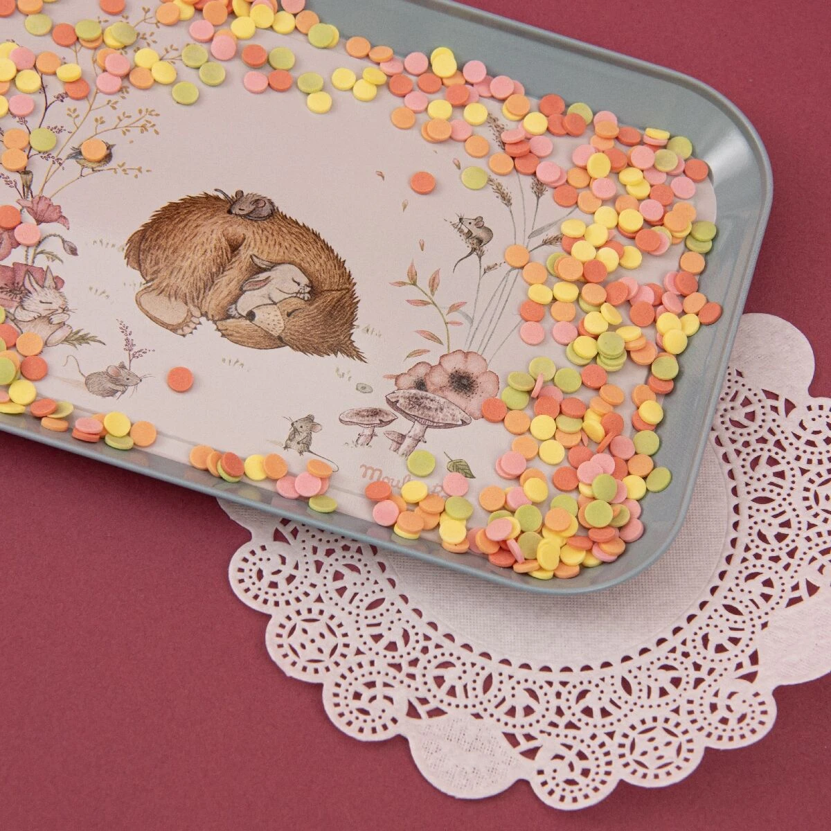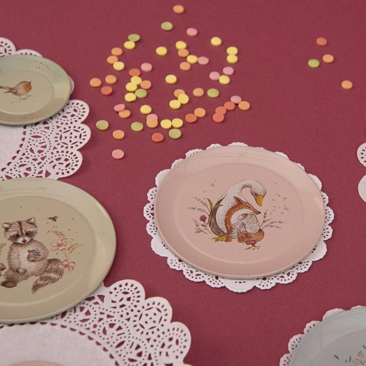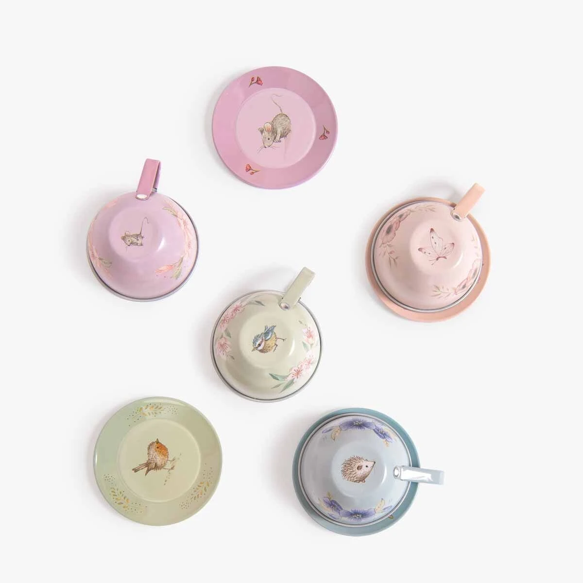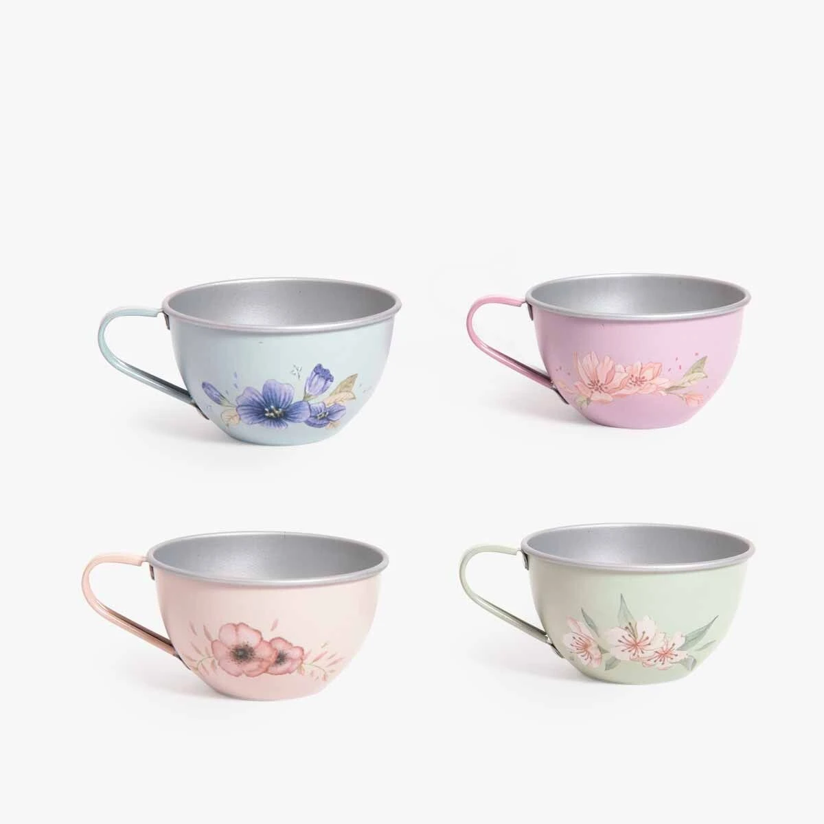 Valise service à thé en métal illustré des fleurs et animaux favoris de nos amies les Rosalie. Elle comprend un plateau, une théière, quatre assiettes à dessert, quatre tasses et leurs soucoupes assorties.