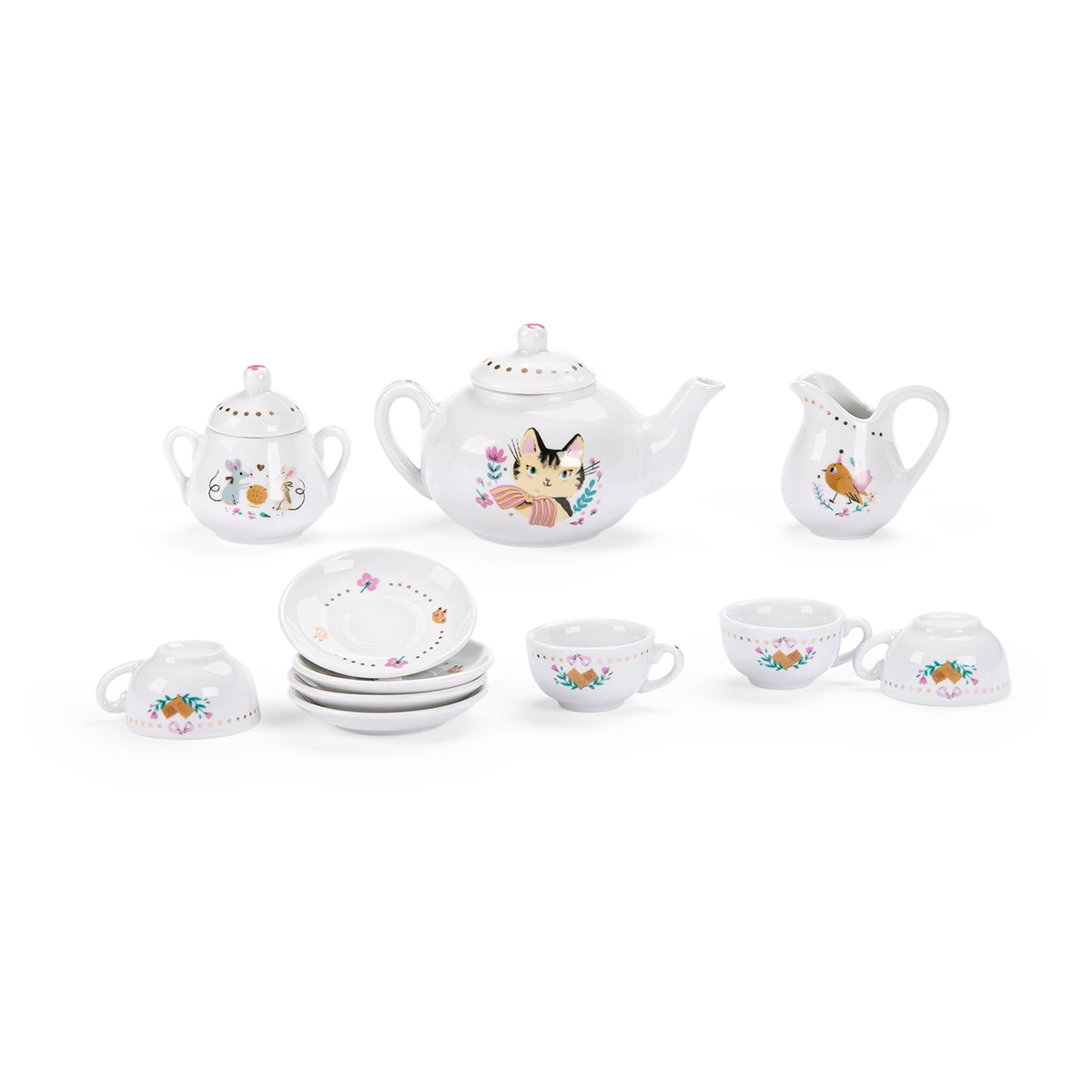 Service à thé en céramique orné de délicats motifs illustrés par Lucille Michieli. présenté dans un ravissant coffret pour servir le goûter à sa maman et ses amies les poupées. Comprend 1 théière. 4 tasses et 4 assiettes. 1 pot à lait et 1 sucrier.
