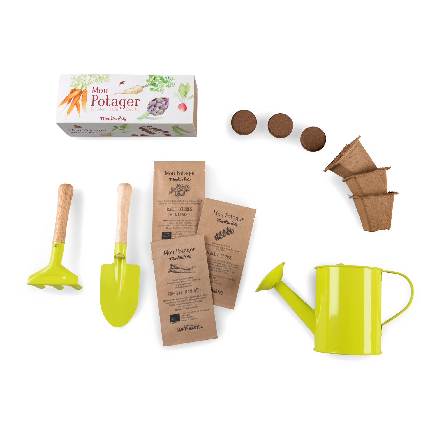 Pour jouer au petit jardinier et regarder pousser son potager! Valise en carton illustrée contenant : un arrosoir, une pelle, un râteau en bois et métal et trois pots miniatures en matière végétale et biodégradable avec graines de légumes à planter (tomates, radis et carottes)