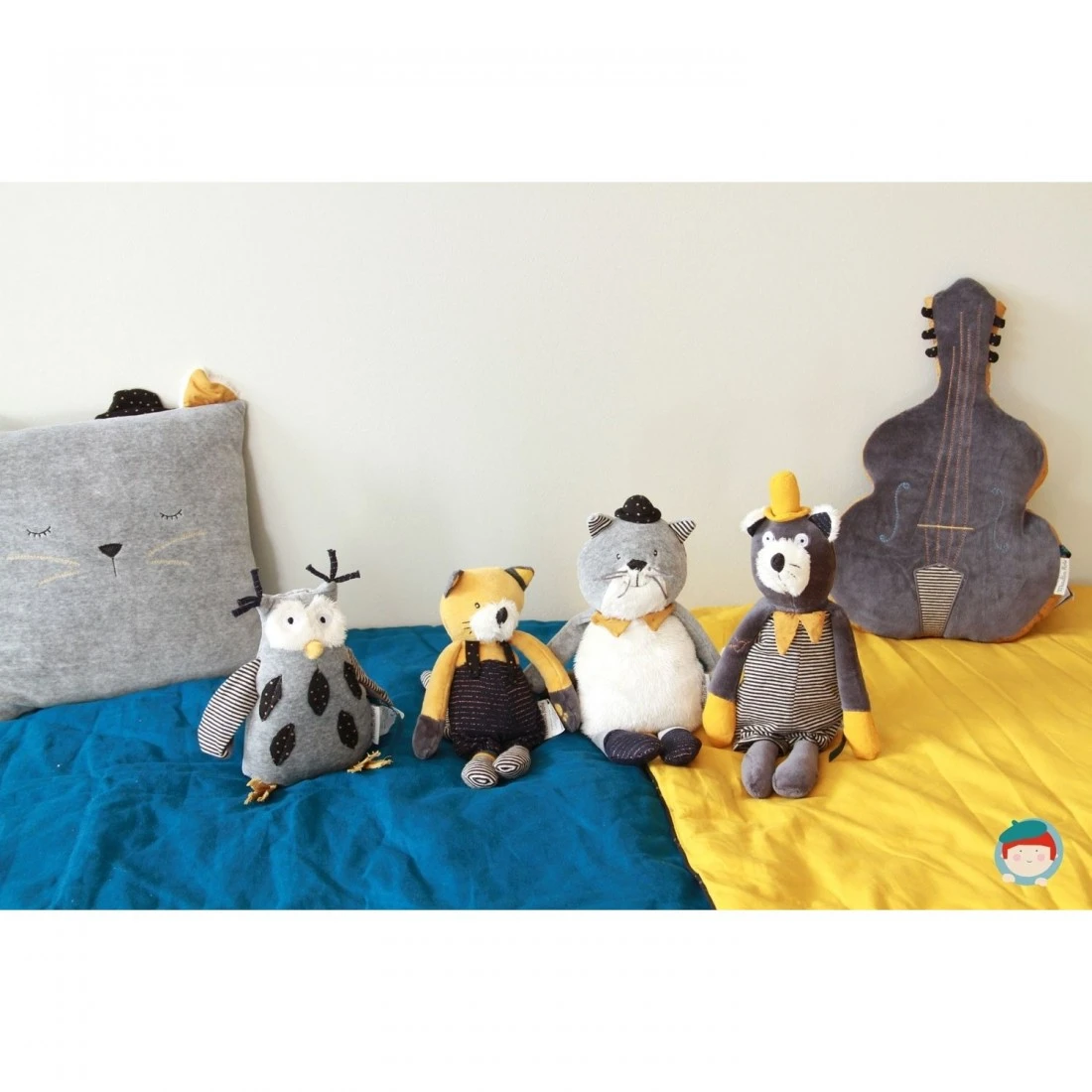 La collection « » est animée par 3 chats sympathiques et élégants, musiciens et dandys. Ces 3 personnages plaisent à tous les enfants, et présentent une gamme résolument mixte et moderne. L’univers des Moustaches est doux et feutré, illuminé par un jaune chaud et des tons gris très actuels. Les 3 chats musiciens, Fernand, Lulu et Alphonse sont des compagnons pour les bébés, et prêtent leur jolie , peluches, jouets et accessoires.