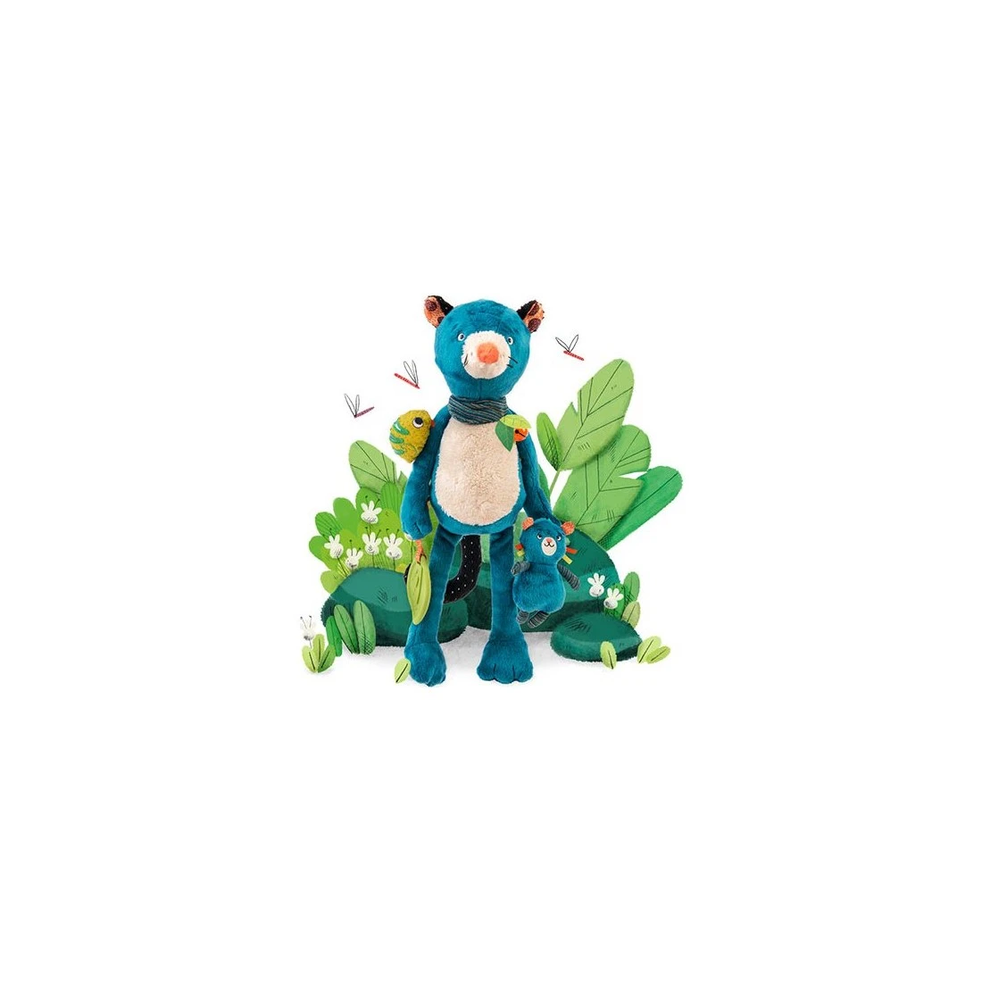 Zimba la , est accompagnée de son petit et de son copain caméléon. Jouet d’éveil idéal pour bébé, avec sa fourrure bleue toute douce, sa longue queue et ses longues pattes à attraper. Au bout d’une de ses pattes, une belle feuille de bananier est un pour soulager les premieres poussées dentaires de bébé. Autour de son cou, un et de jolies feuilles colorées. Le caméléon est un quand bébé l’attrape. Le petit bébé panthère est un adorable à l’intérieur.