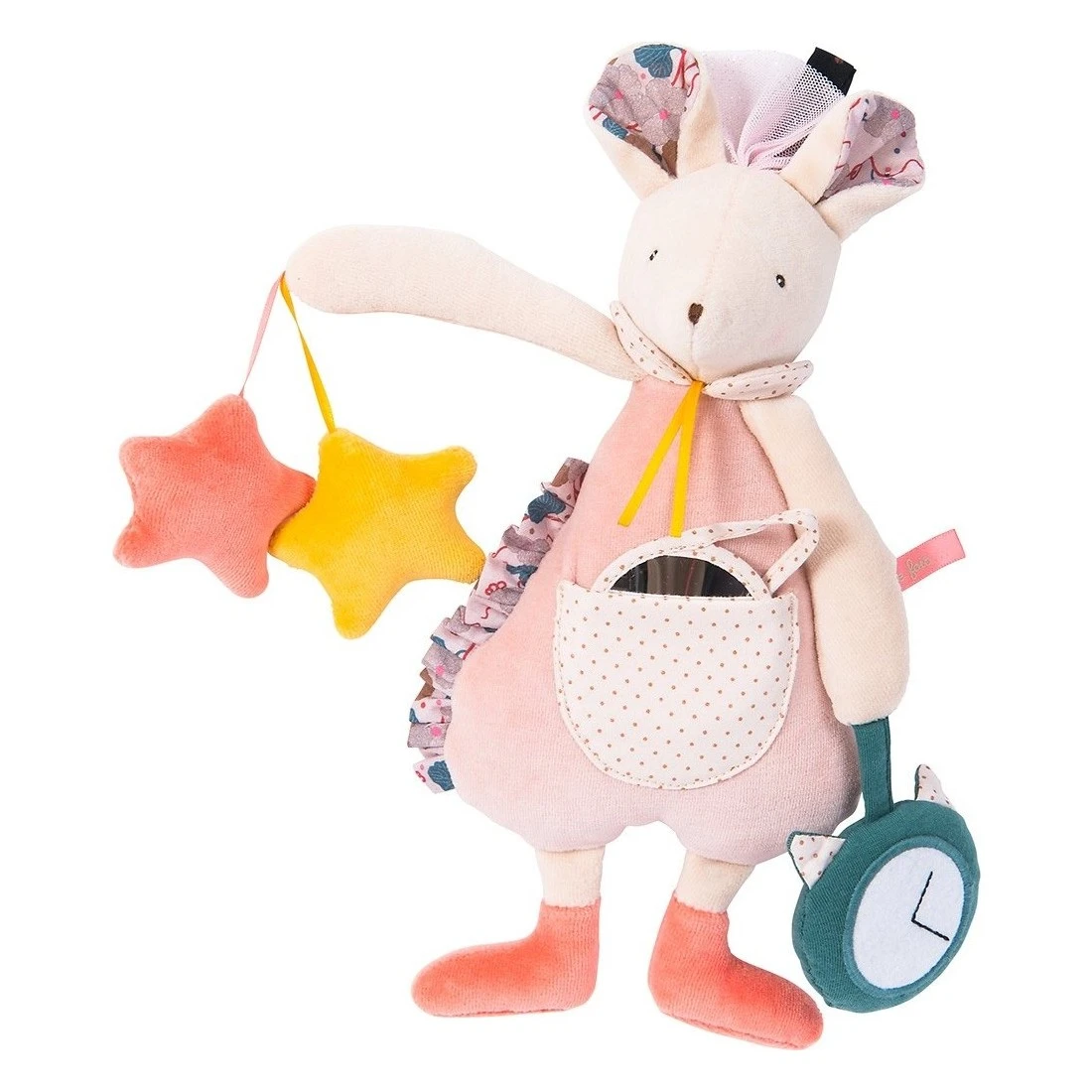 Idée de cadeau naissance original, la souris d’activité « Il était une fois » convient particulièrement bien aux petites filles, avec des couleurs tendres et douces aux tons roses. La peluche d’activités dispose de plusieurs activités d’éveil, un dans le réveil, le caché dans le ventre de la souris, un bruit de dans les étoiles, et le dans les oreilles.