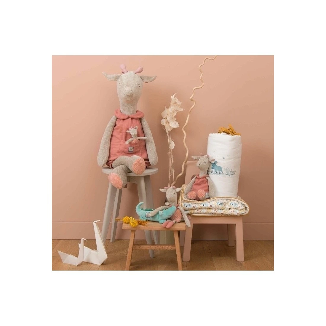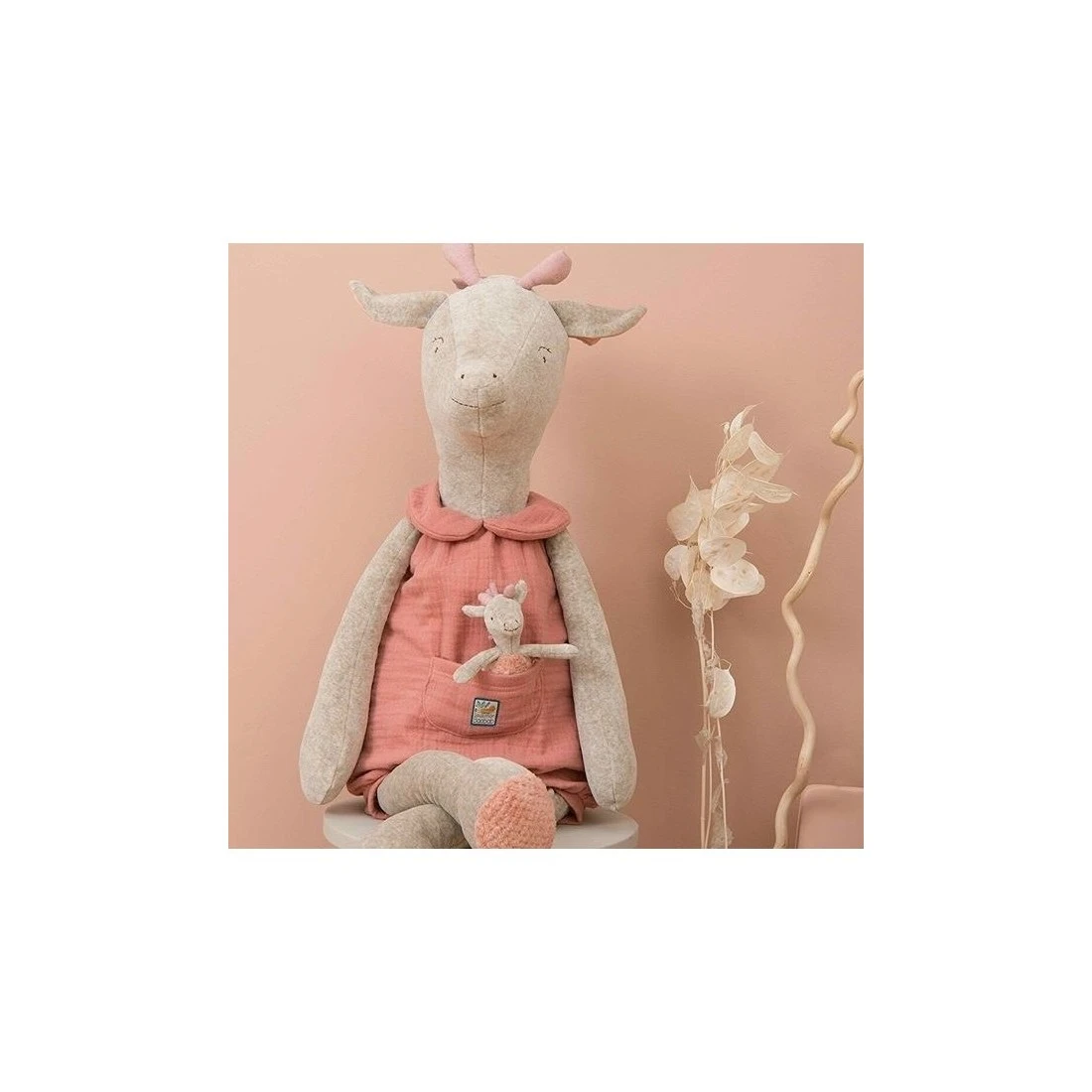 La de Bibiscus la girafe , accompagné de son bébé girafe dans sa poche ventrale, est une grande beige chiné et rose tendre, avec un hochet, du papier crissant et un pouet pouet.