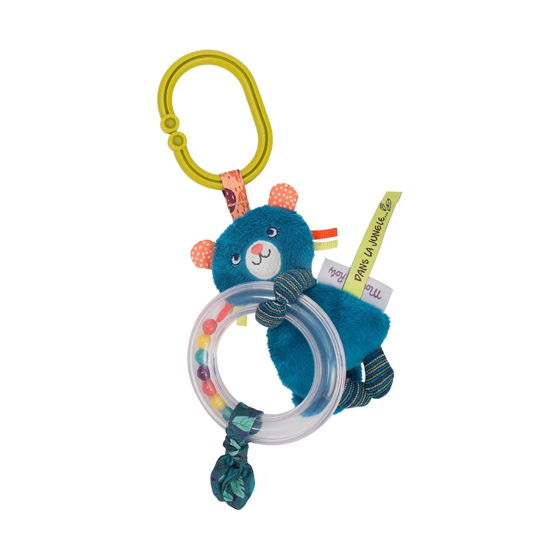 Fabriqué dans des tissus très doux et colorés, il est le compagnon idéal de bébé à emmener partout. Accroché à la poussette ou au siège auto, la panthère tient dans ses pattes un anneau rempli de billes colorées qui attireront l’attention de bébé. Sa taille est idéal comme facile à attraper et à tenir. Ce petit développe la motricité fine et l’éveil de bébé.