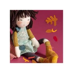 Une poupée de chiffon au visage doux et illustré, avec de longs cheveux bruns en jersey.