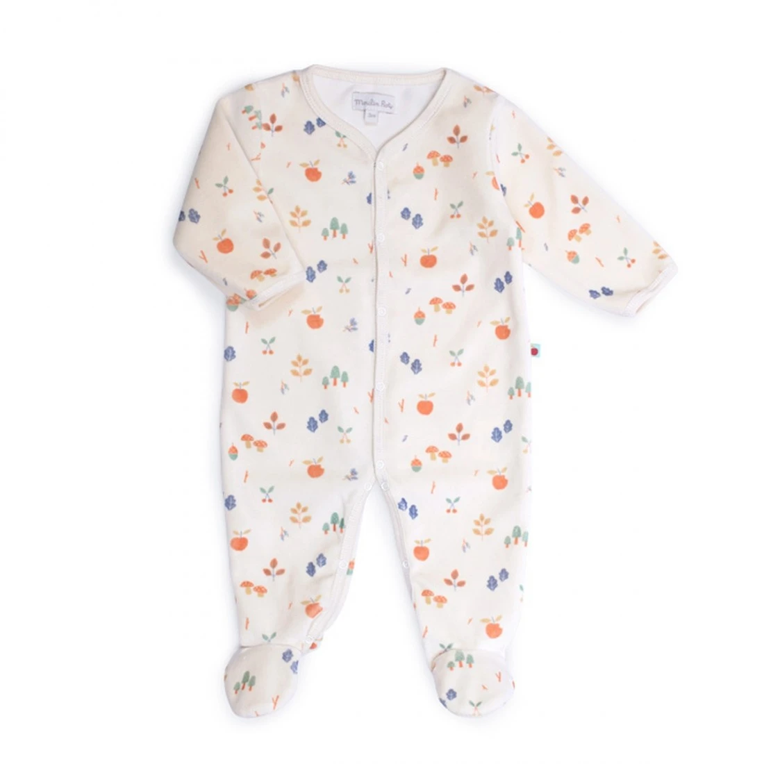 Le pyjama en velours Moulin Roty Pomme des bois est composé à 80 % de coton labellisé Oeko-Tex®, afin de respecter la peau délicate de votre tout petit. De jolis motifs « cueillette » de la collection sont délicatement répartis sur toute sa surface, comme pour accompagner en douceur votre bébé au pays des rêves.