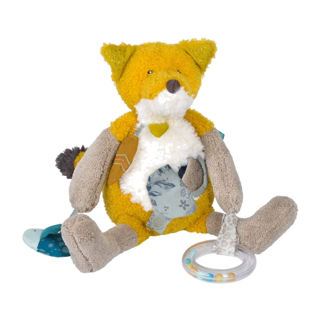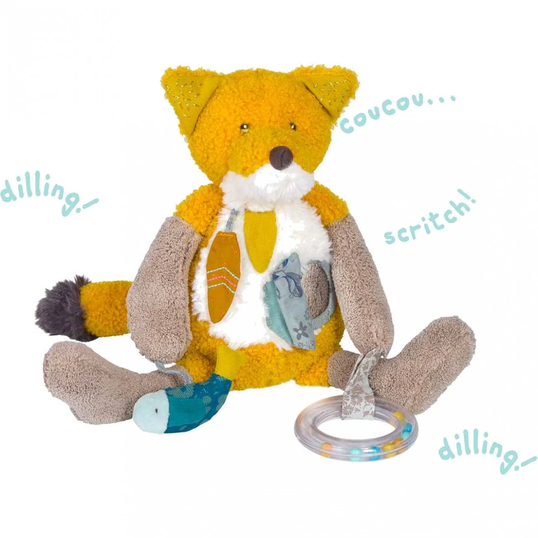 Renard d’activités au doux pelage de fourrure bouclette moutarde et autres matières amusantes, chargé d’accessoires pour divertir bébé : pouet-pouet dans le bout de sa queue, hochet, miroir, plastique qui fait du bruit et anneau à billes.