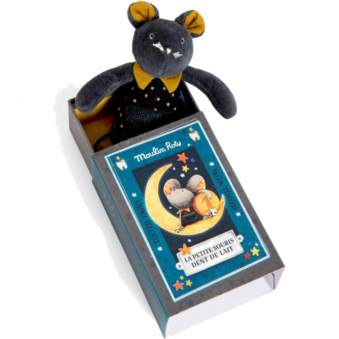 L’amie se range dans sa jolie boîte illustrée. Adorable en tenue à pois cuivrés et chaussettes rayées, la souris en velours garde précieusement les petites dents dans sa poche aux reflets d’or…