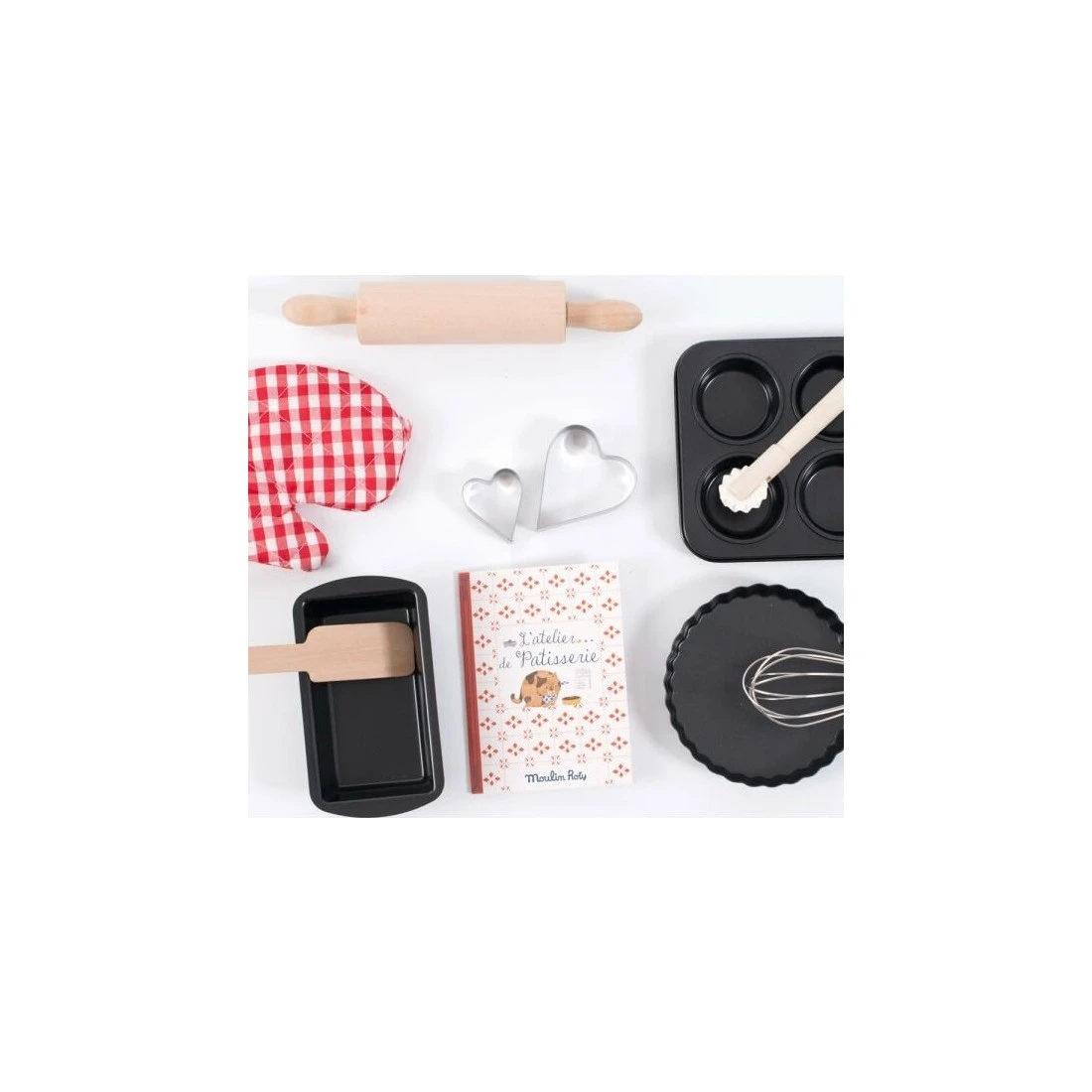 Moules à gâteaux, emporte pièces, rouleau à pâtisserie, un fouet et un livret de 9 recettes sucrées, votre enfant peut cuisiner de vraies gourmandises.