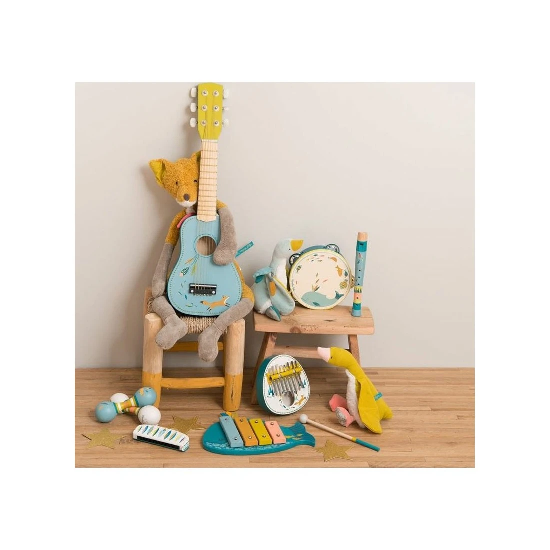 Idéal pour un futur musicien qui développe ainsi ses capacités motrices et auditives en s’amusant. En bois peint, cet instrument est décoré de plumes en feutrine.